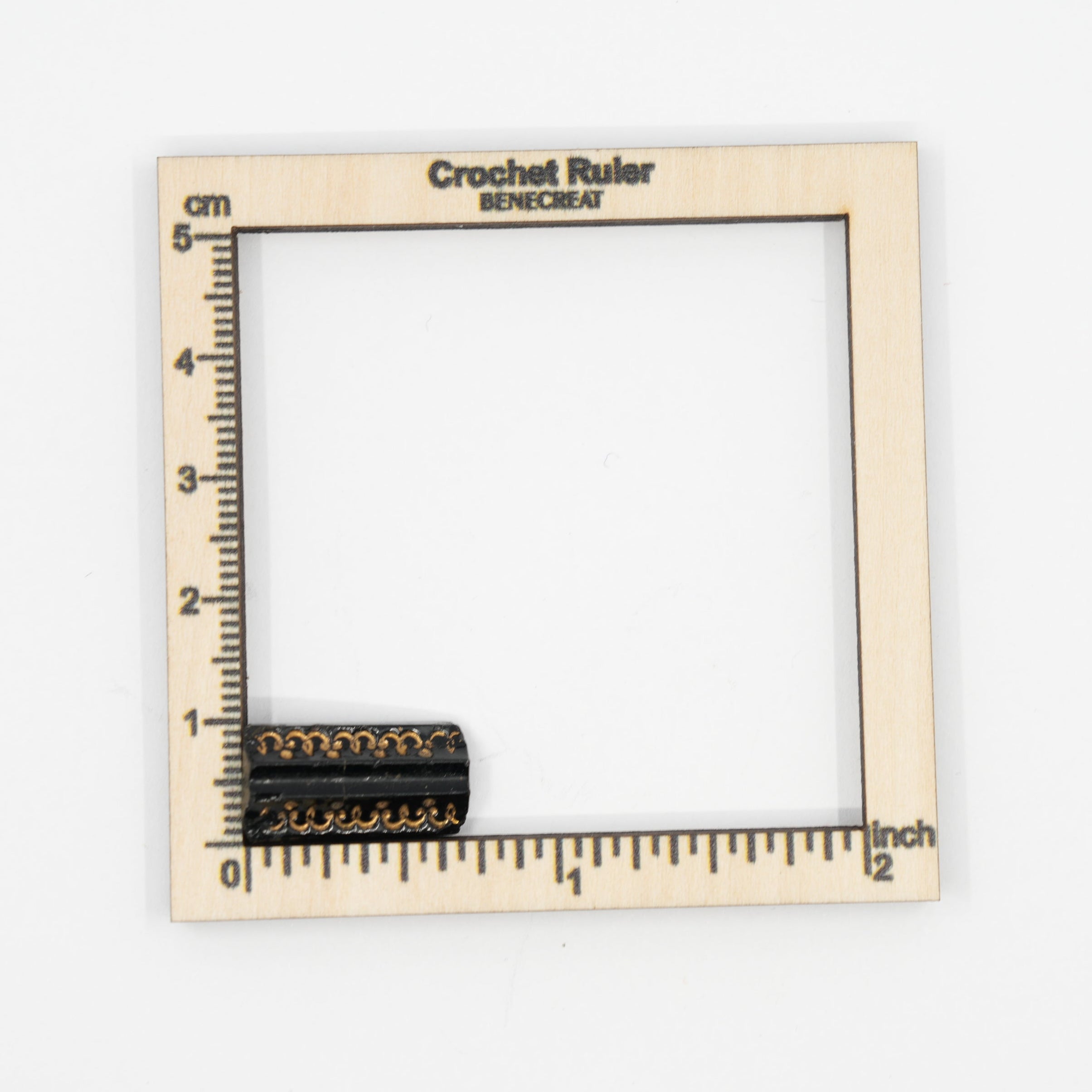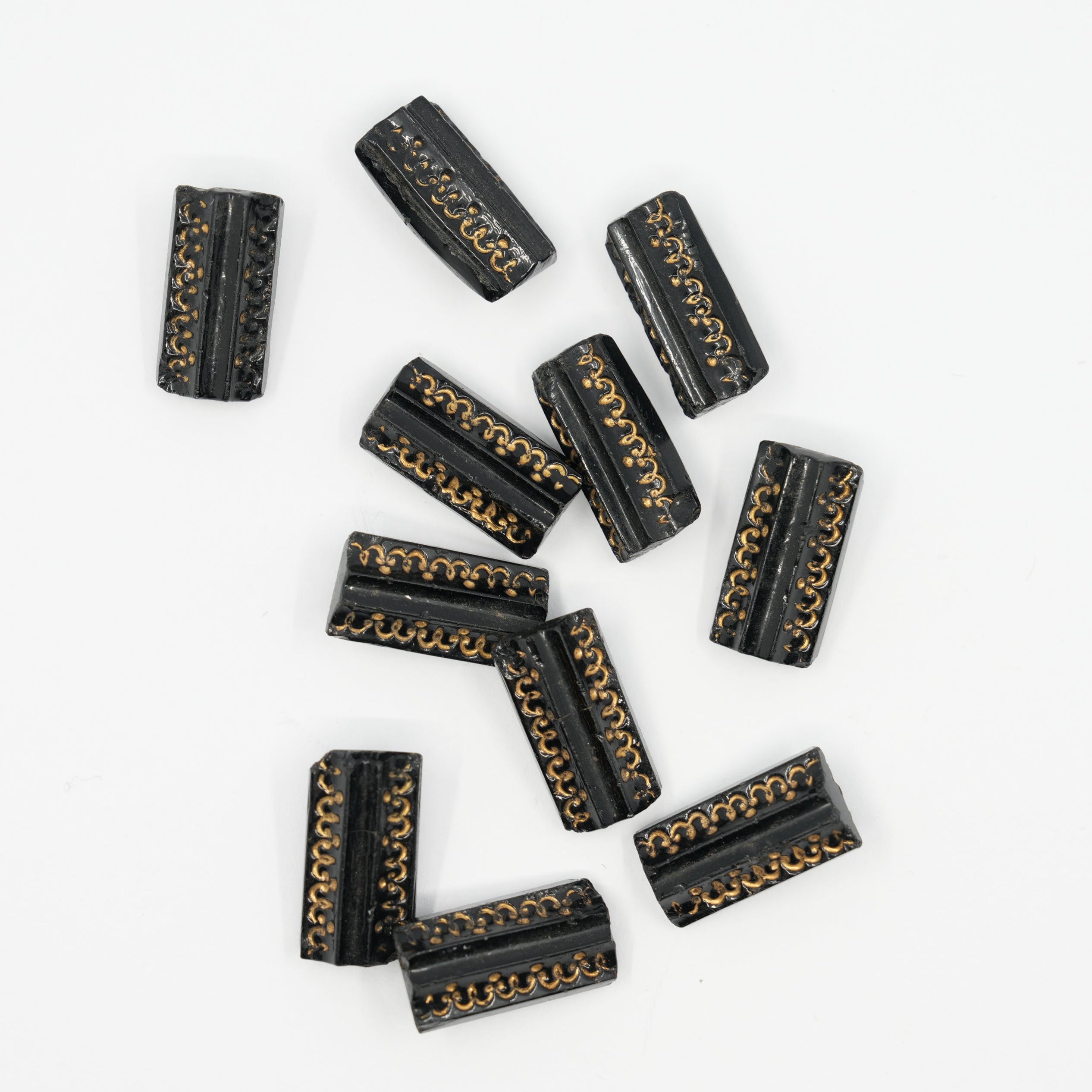 A unique collection of eleven vintage rectangular buttons featuring a raised central ridge and ornate golden scroll detailing along each edge. Molded from glossy black plastic, these buttons have a bold presence with a hint of baroque charm. Ideal for historical or theatrical garments, structured blouses, or creative embellishment projects.