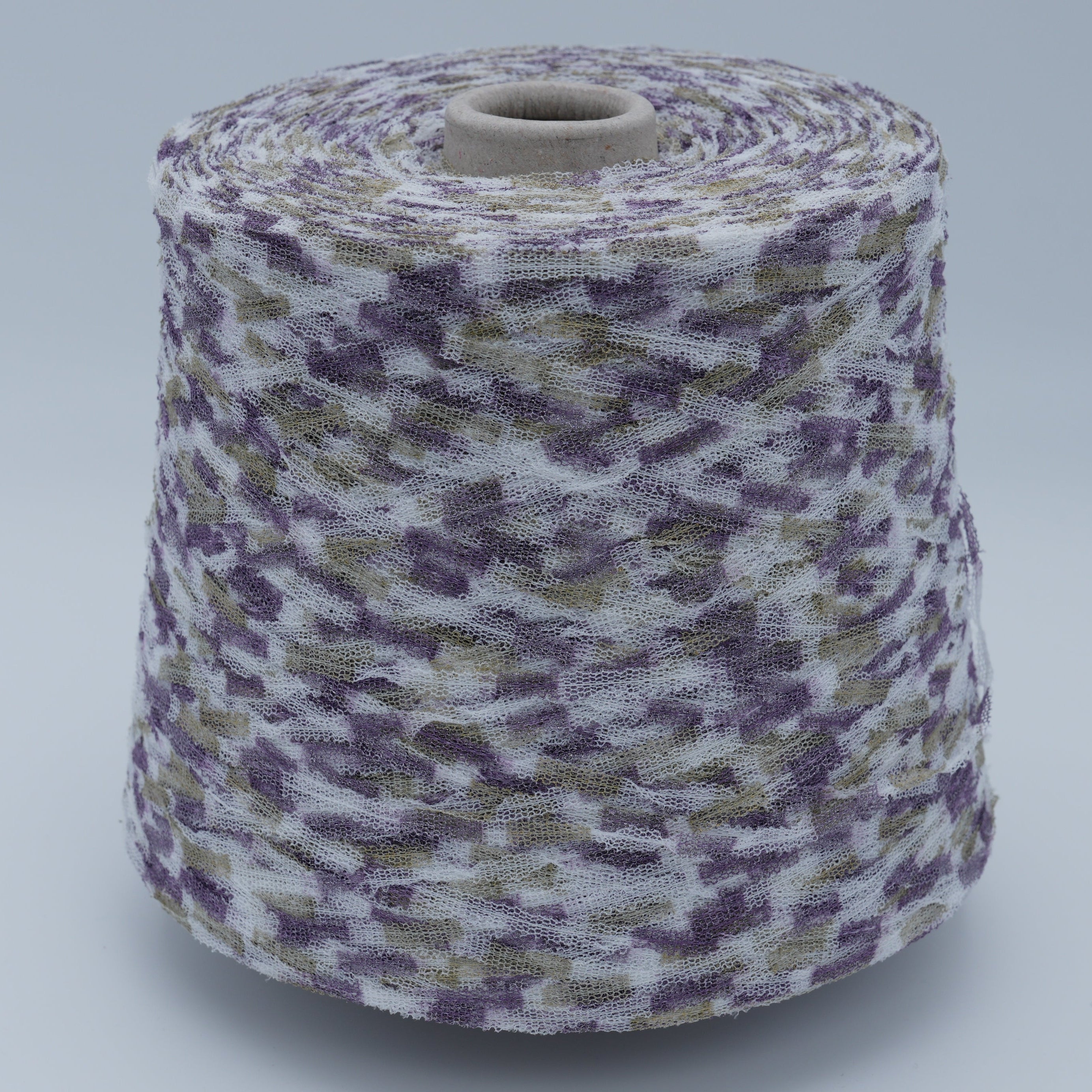 A creative polyamide ribbon-mesh yarn from Vimar, featuring a unique textured open-net structure and sectional dyeing that blends soft lilac, ivory, and olive tones into a striking modern palette. Lightweight yet sculptural, it produces a semi-transparent, patterned surface with subtle shimmer and tactile depth.