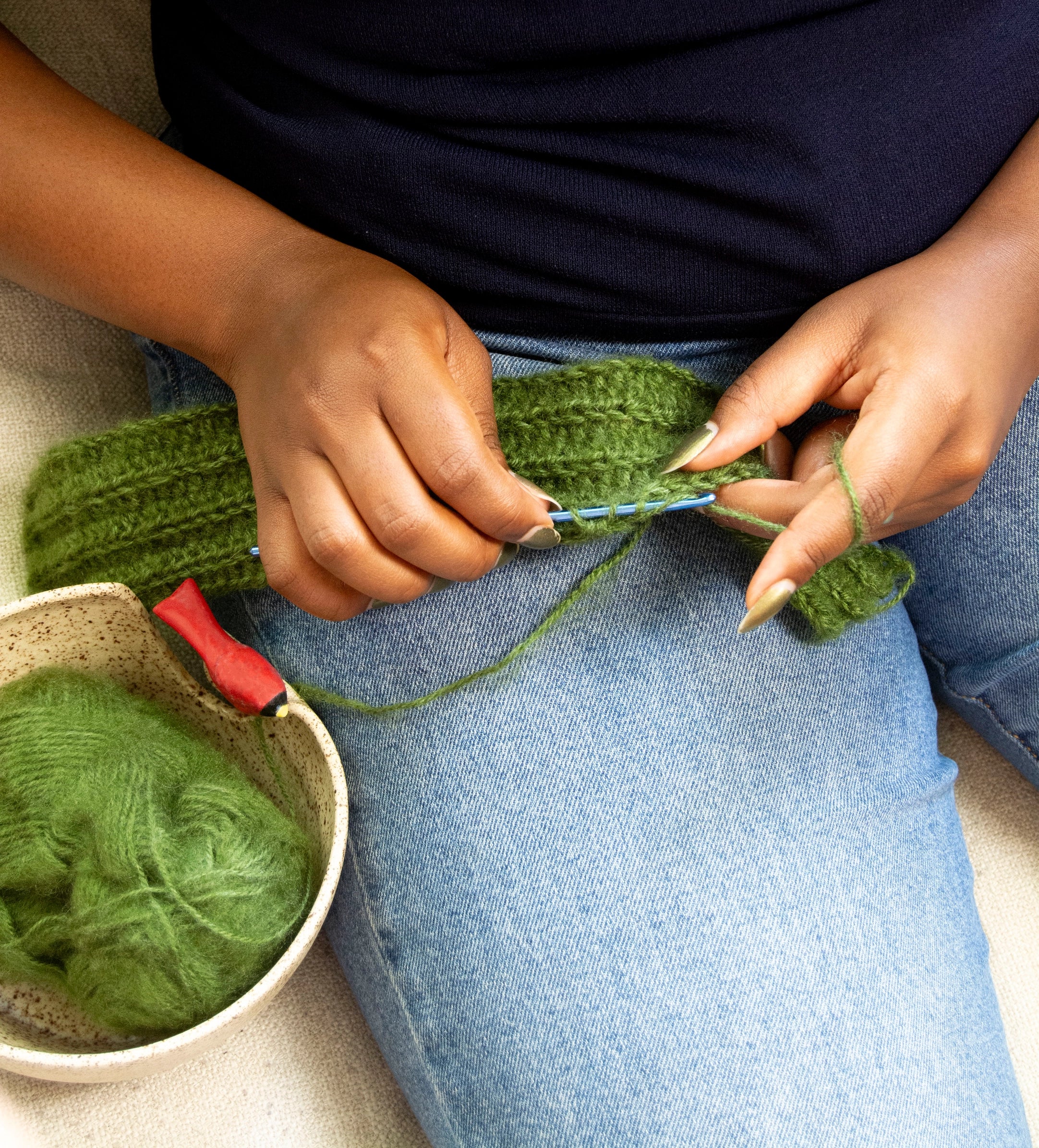 Keep yourself company and keep your yarn neat while you knit, crochet or weave with this ceramic birdie yarn bowl. Top your yarn bowl with one of three delightful birdies: Chickadee, Cardinal, or Sparrow. Thrown in stoneware on the wheel and then altered and topped with the hand-painted Chickadee, Cardinal, or Sparrow, this yarn bowl is fun and functional. The deep 'j' hook keeps your yarn from slipping, and the adequate size accommodates various yarn ball sizes. Bowl dimensions are 6 inches diameter by 3.5 inches deep. Flat foot helps keep bowl stable while working. Handmade in Western New York.