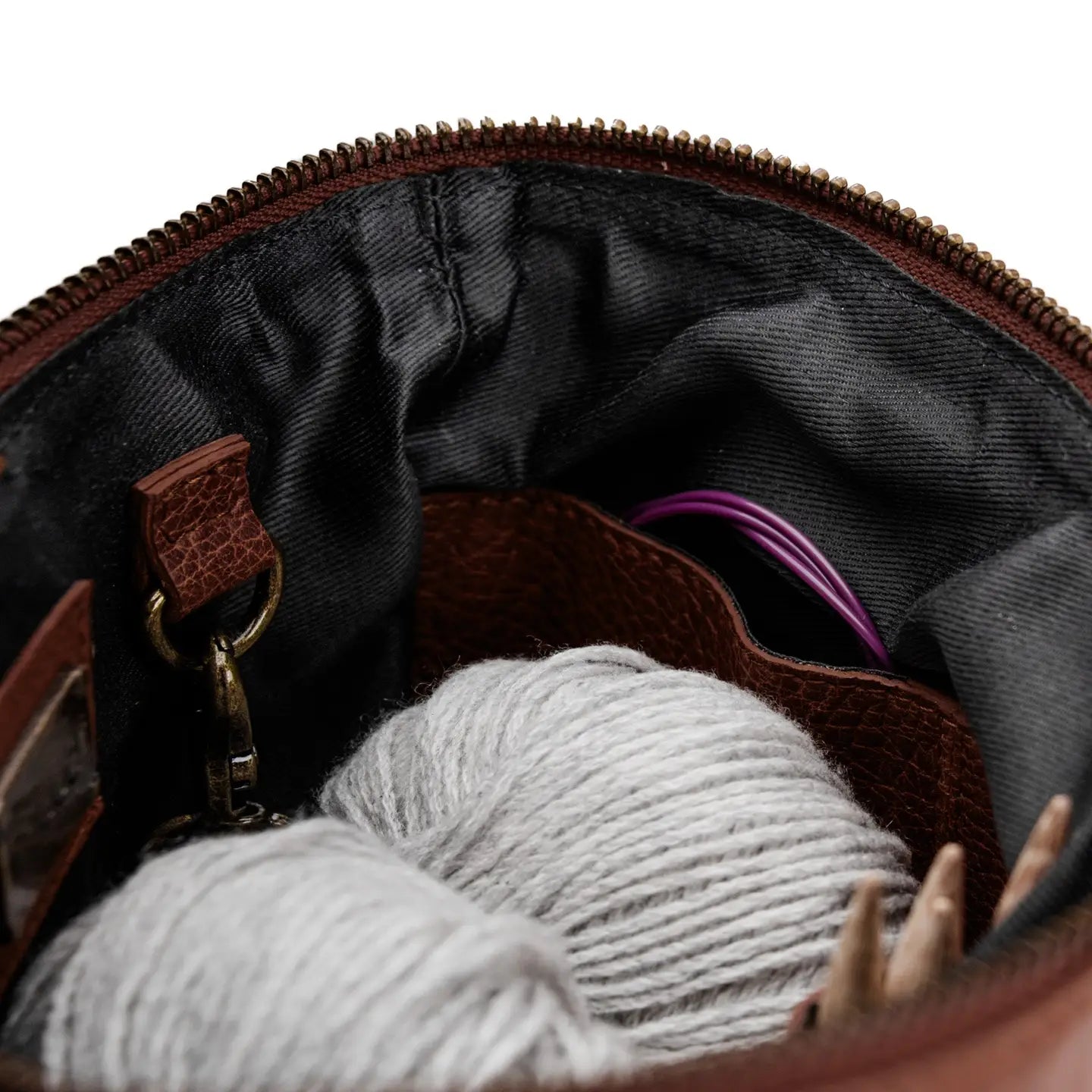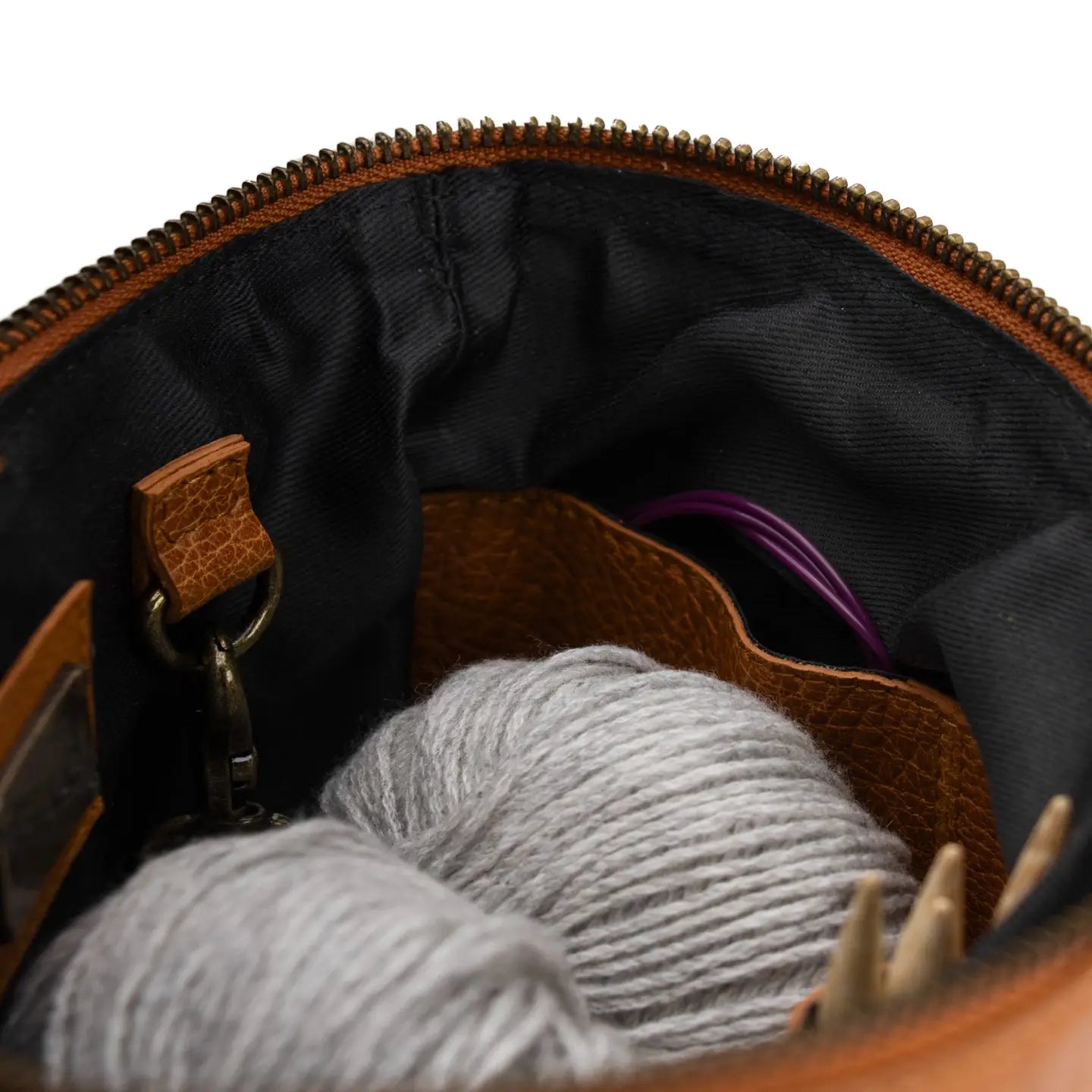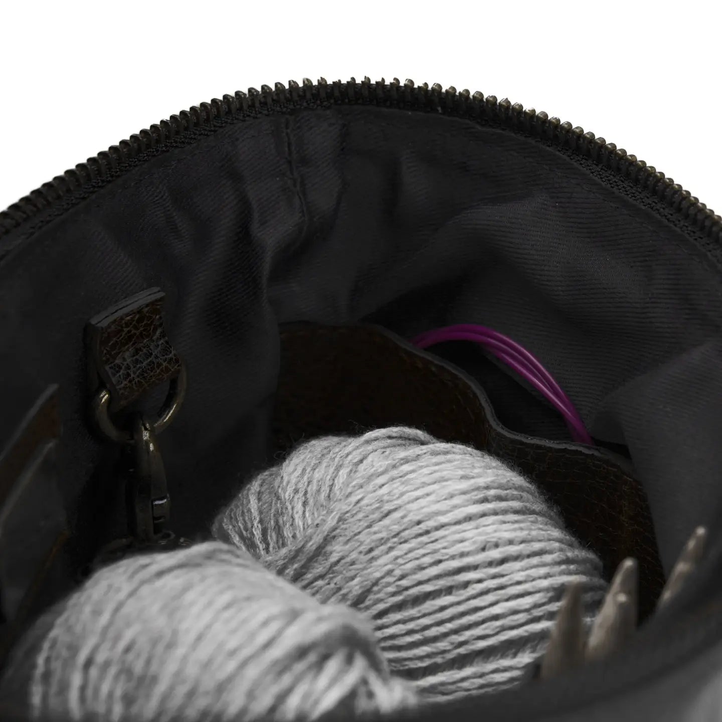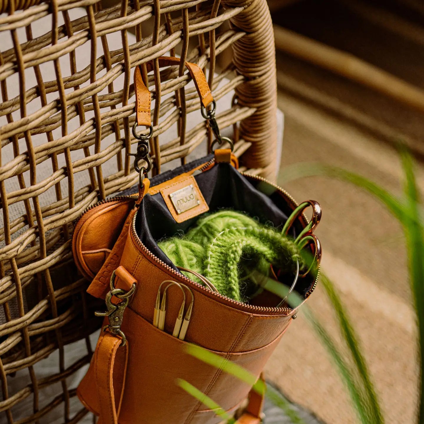 Grace from Muud is an elegant and functional leather project bag, designed in a distinctive crescent shape. Perfect for storing and transporting knitting and crochet projects, it combines practical features with a stylish silhouette.