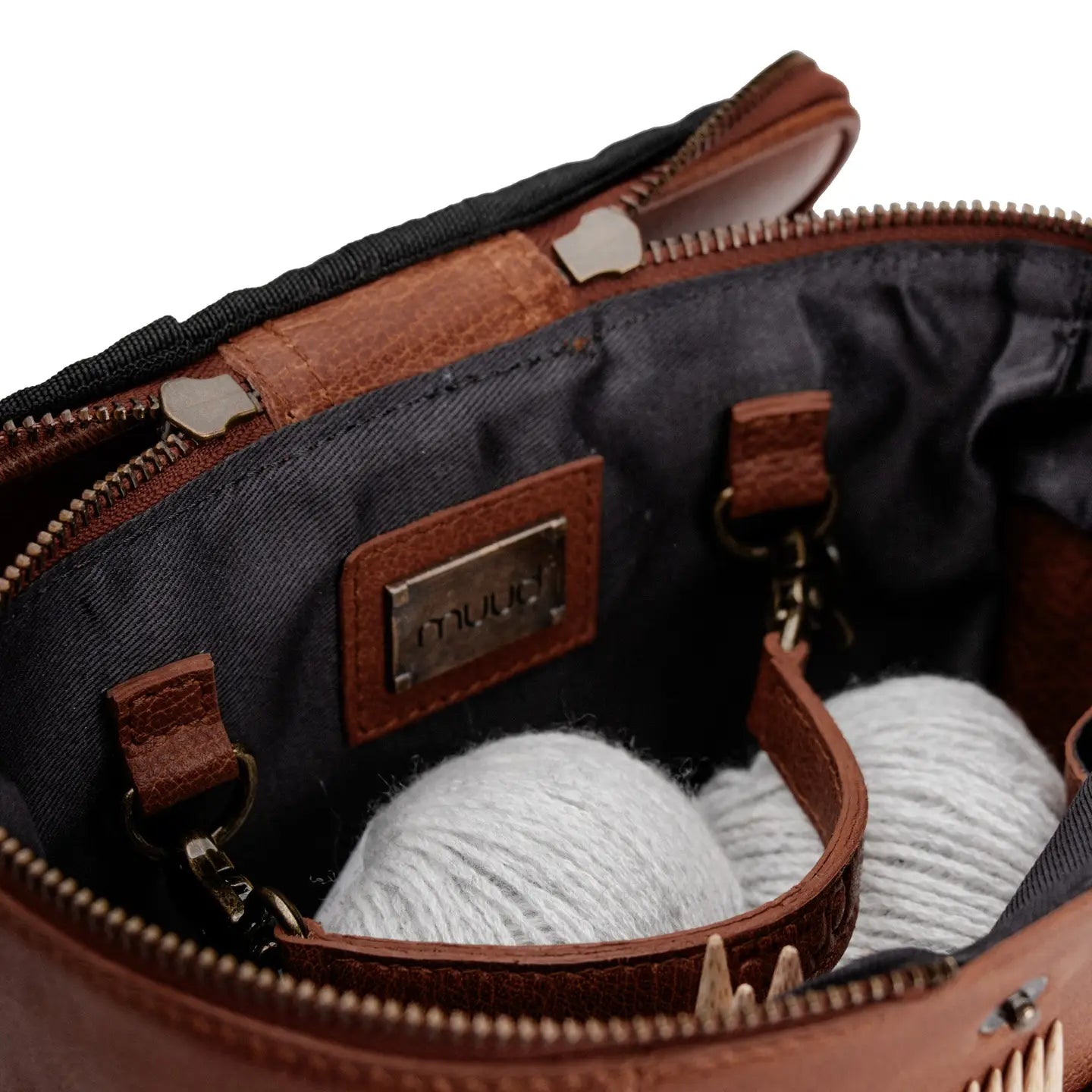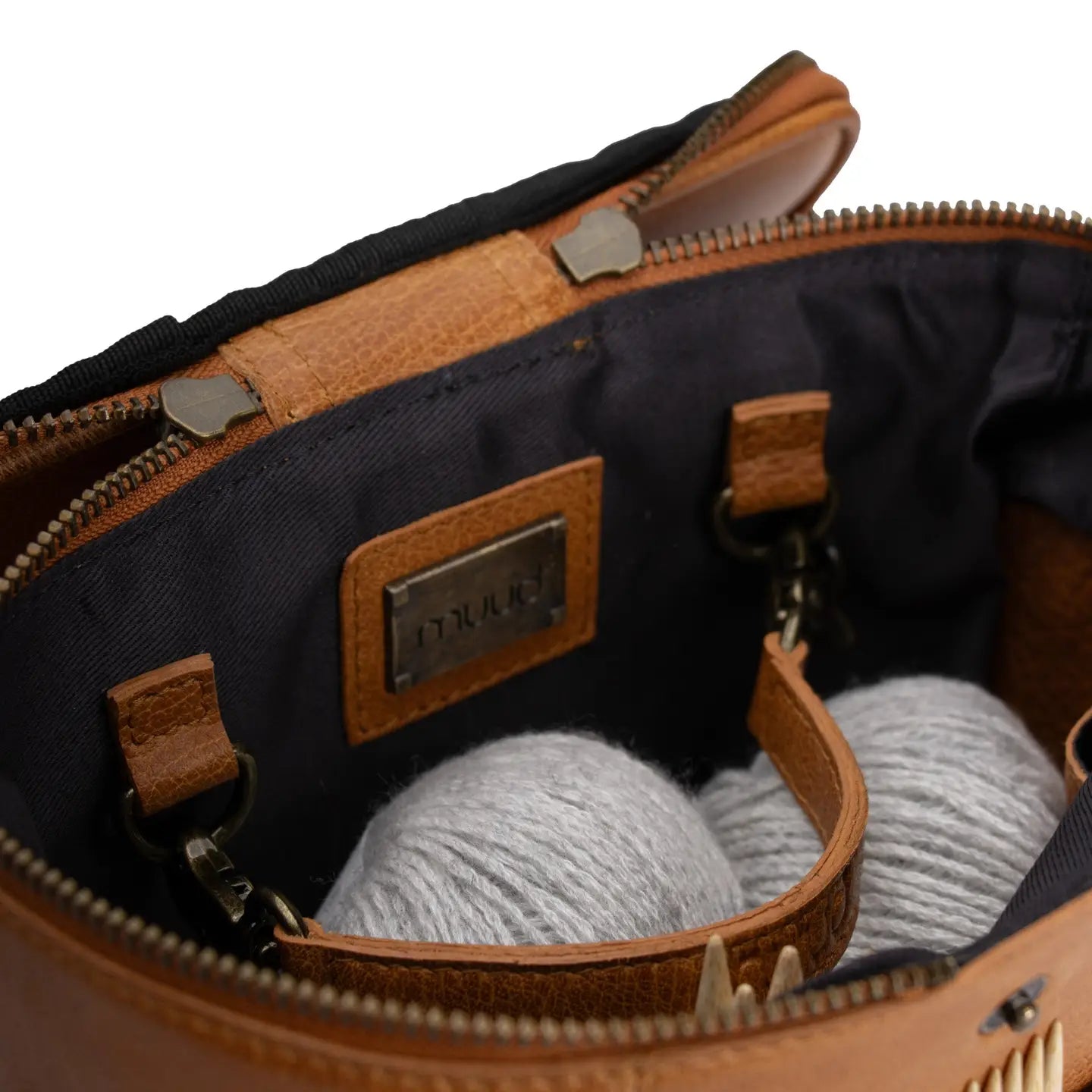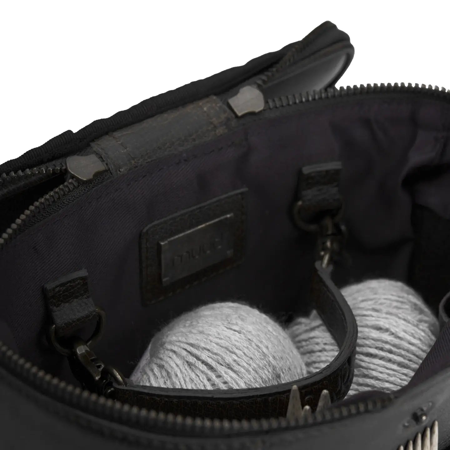 Grace from Muud is an elegant and functional leather project bag, designed in a distinctive crescent shape. Perfect for storing and transporting knitting and crochet projects, it combines practical features with a stylish silhouette.