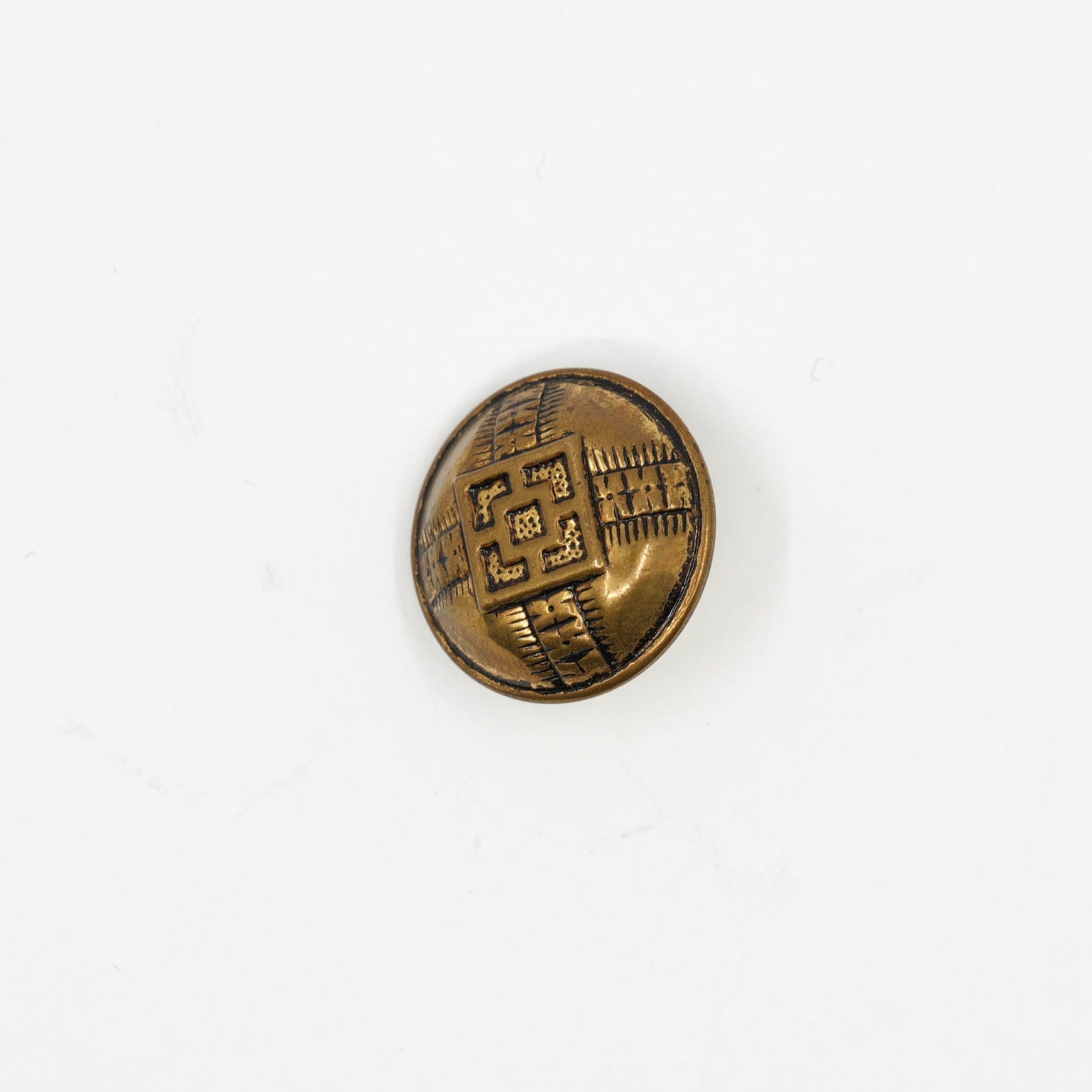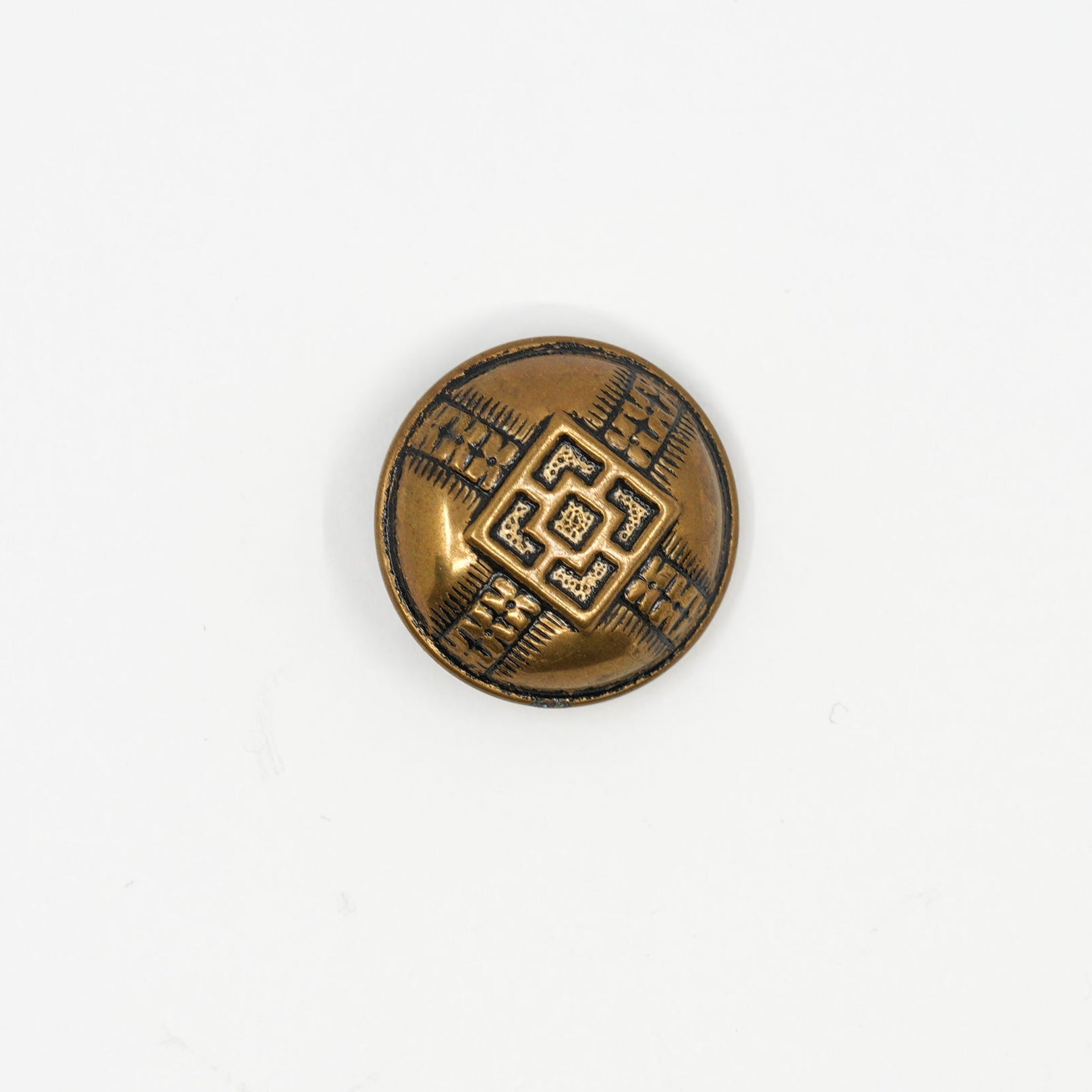 A full vintage set with timeless structure and ornamental appeal. These dome-shaped buttons are cast in an antique brass tone with a symmetrical engraved motif — a cross-hatched grid that evokes folk textiles or architectural detail. The raised central medallion is framed by four directional patterns, giving each button strong visual balance and quiet strength.