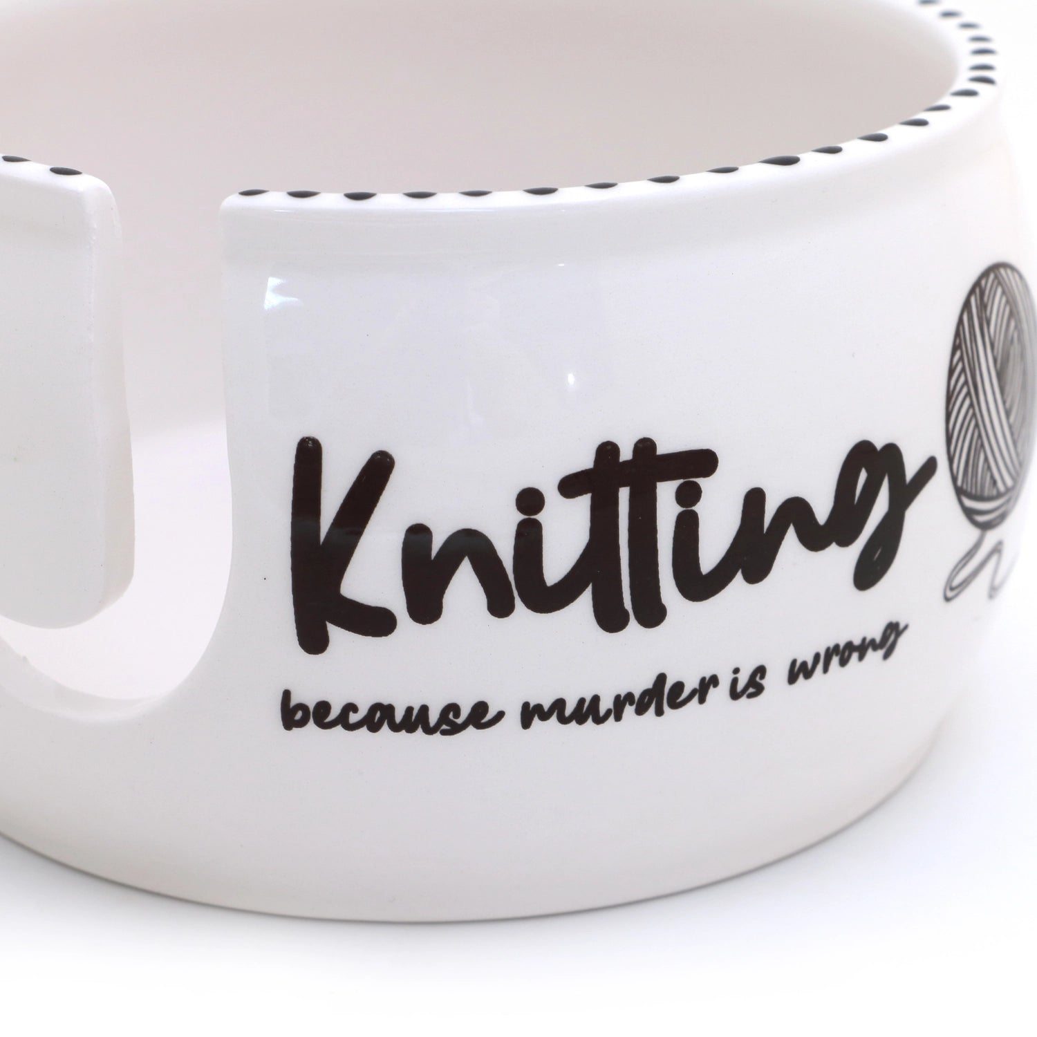 KNITTING Because Murder is Wrong. Handmade ceramic yarn bowl is a great gift for a knitter. Some warm and fuzzy anger management for the person who wields those sharp needles. Handmade in my New Jersey studio. Glazed a glossy white with black accents on rim. Features a hooked exit to remove the yarn. Yarn bowls keep yarn from getting tangled and are a great place to store work in progress.