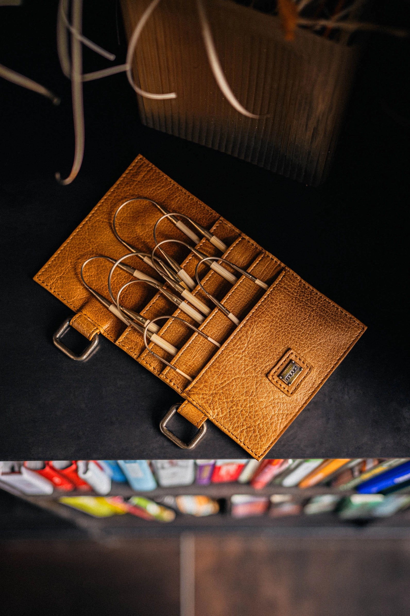 Made from premium full-grain leather, this compact case provides secure storage without sacrificing style. It features two sturdy metal rings for easy attachment to the MUUD Carita Bag, allowing you to expand your storage system and keep all your knitting tools within easy reach. Perfect for both home and travel, Carita F is a timeless essential for crafters who value quality and organization.
