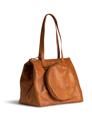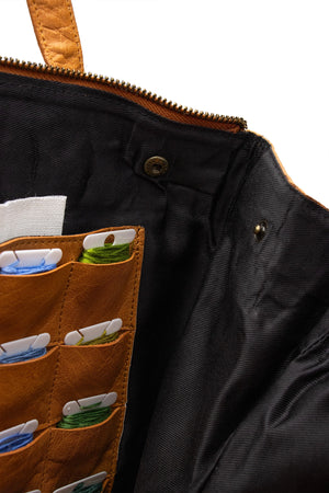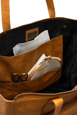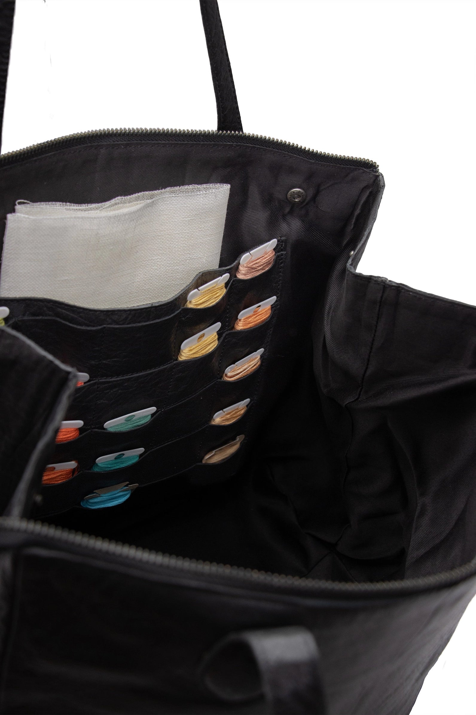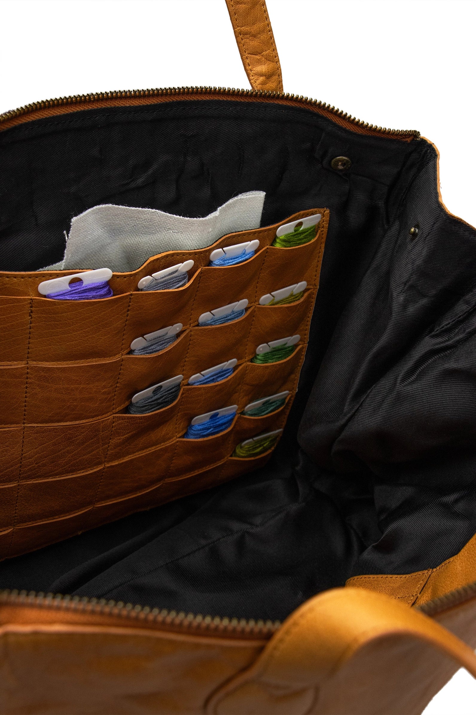 Handcrafted from premium quality leather, Fro offers a spacious main compartment perfect for storing embroidery, knitting, or crochet supplies. The round front pocket provides additional organization for smaller essentials, while the long structured handles make it comfortable to carry over the shoulder or by hand.