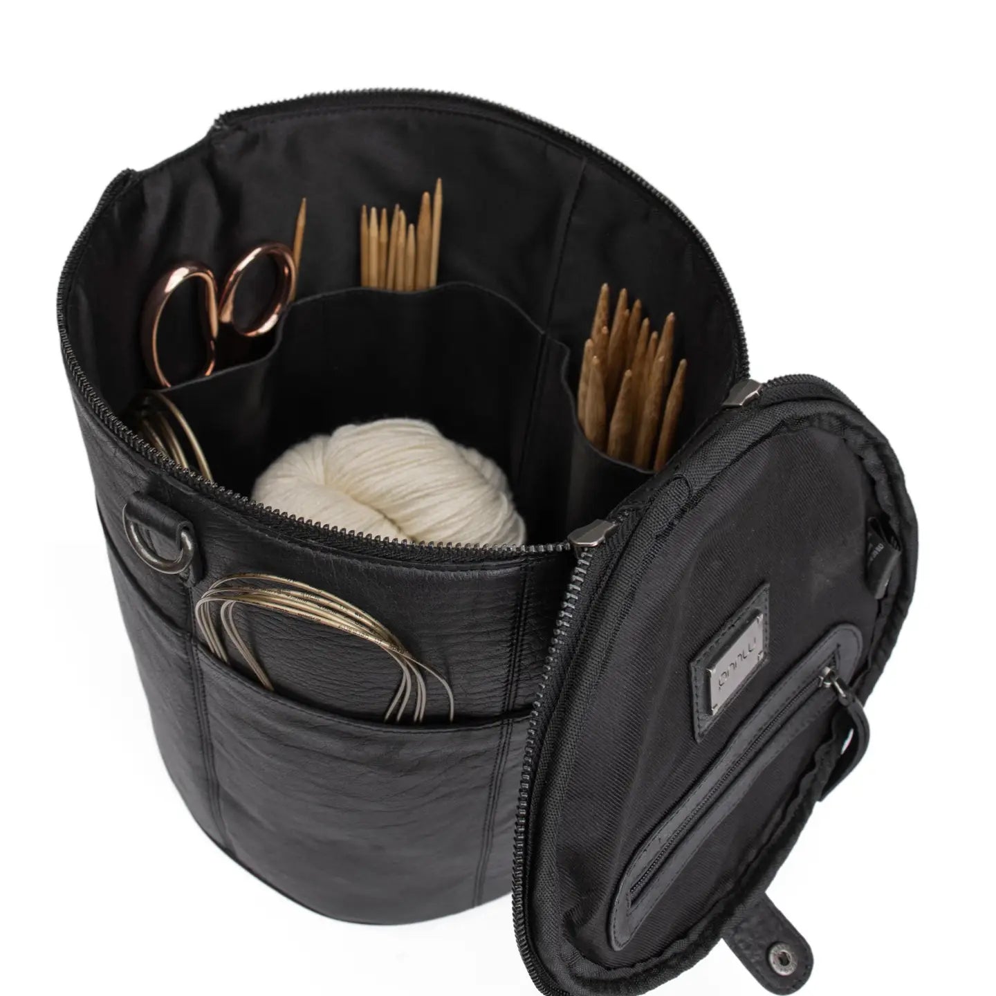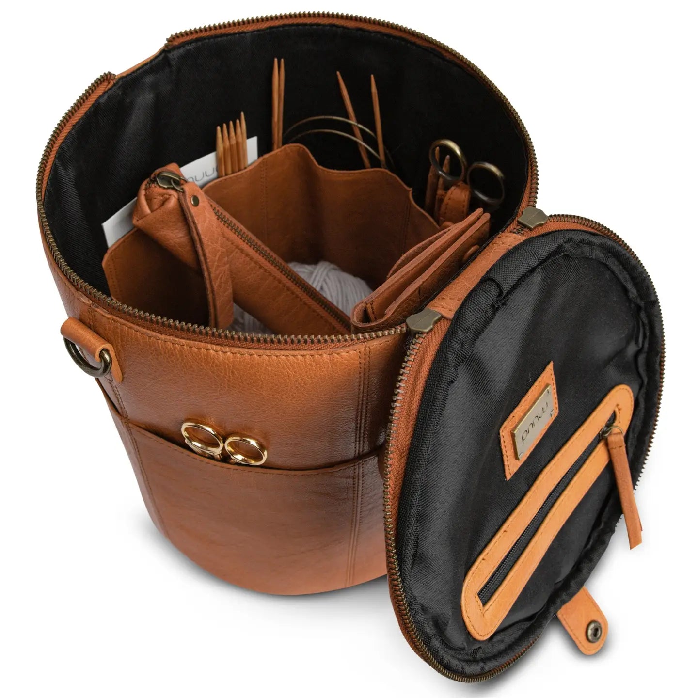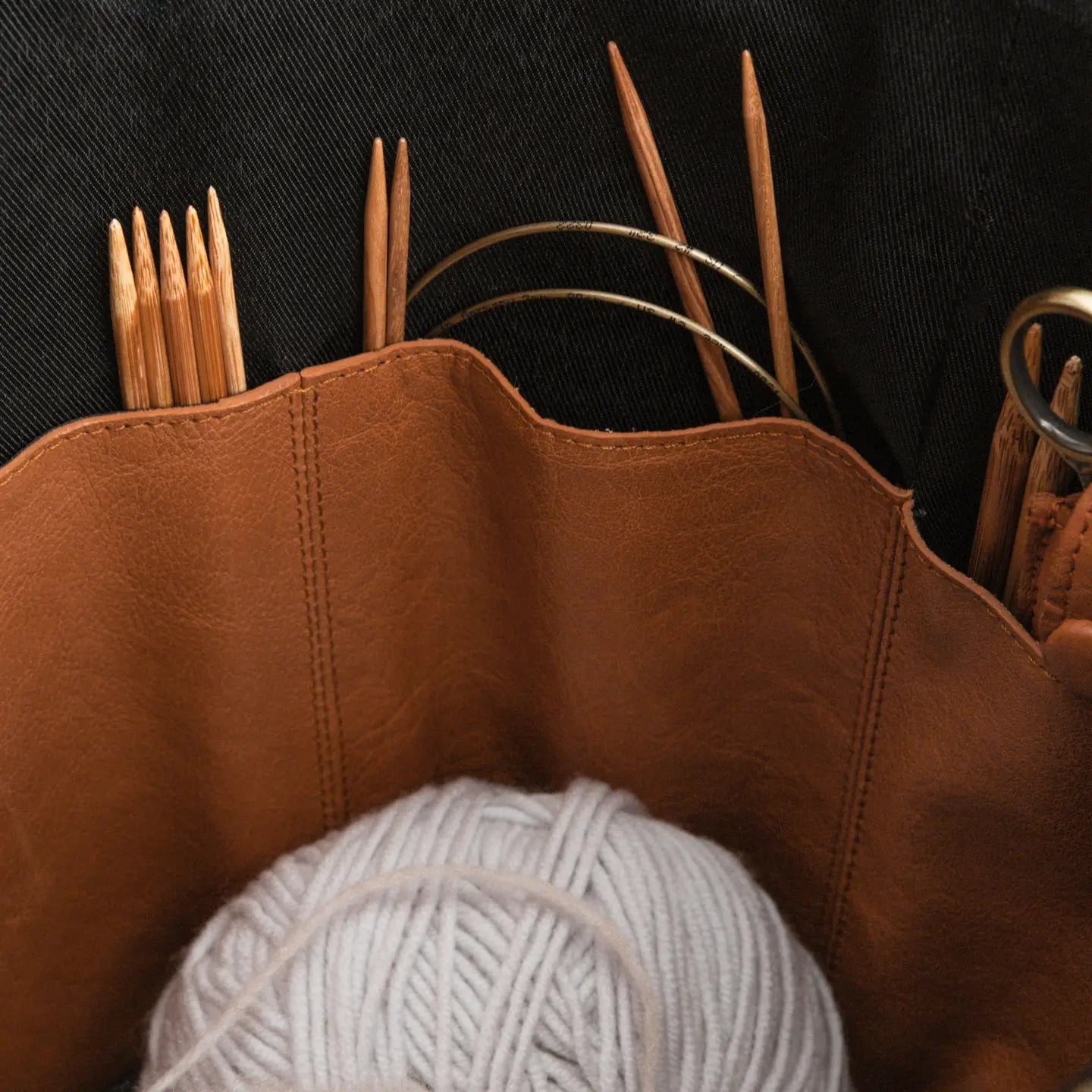 The Saturn XL by Muud is a beautifully handcrafted leather project bag designed to hold everything you need — from circulars and DPNs to yarn cakes, scissors, and stitch markers. With its tall, structured form and carefully considered interior, this is more than a bag — it’s a mobile studio for your creative work.