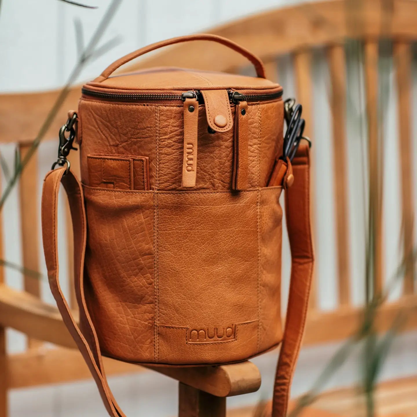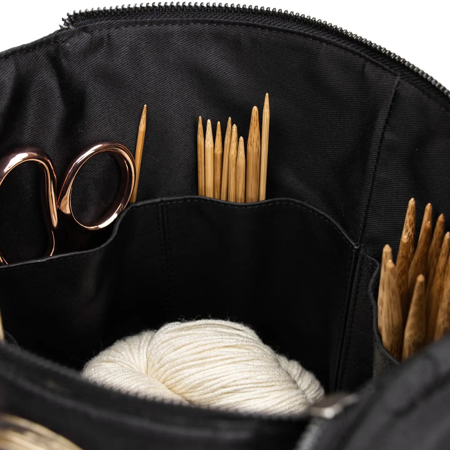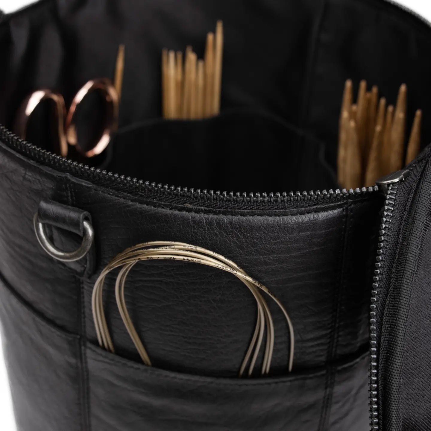 The Saturn XL by Muud is a beautifully handcrafted leather project bag designed to hold everything you need — from circulars and DPNs to yarn cakes, scissors, and stitch markers. With its tall, structured form and carefully considered interior, this is more than a bag — it’s a mobile studio for your creative work.