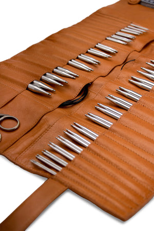 Made from premium genuine leather, the Stockholm XL combines timeless design with exceptional functionality. Inside, you’ll find slots for up to 16 sets of interchangeable knitting needles ranging from 2 mm to 15 mm, along with multiple pockets for cables, tools, and small notions. A large zippered pocket provides additional storage for accessories such as scissors, stitch markers, or measuring tape.