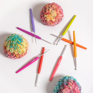 The hooks are made from nickel-free aluminum and glide smoothly through stitches. Each hook features a brightly colored soft grip handle with the metric size clearly printed, making it easy to identify the right hook while working.