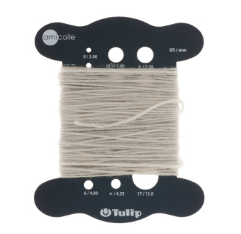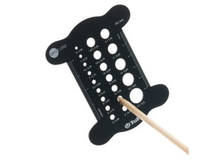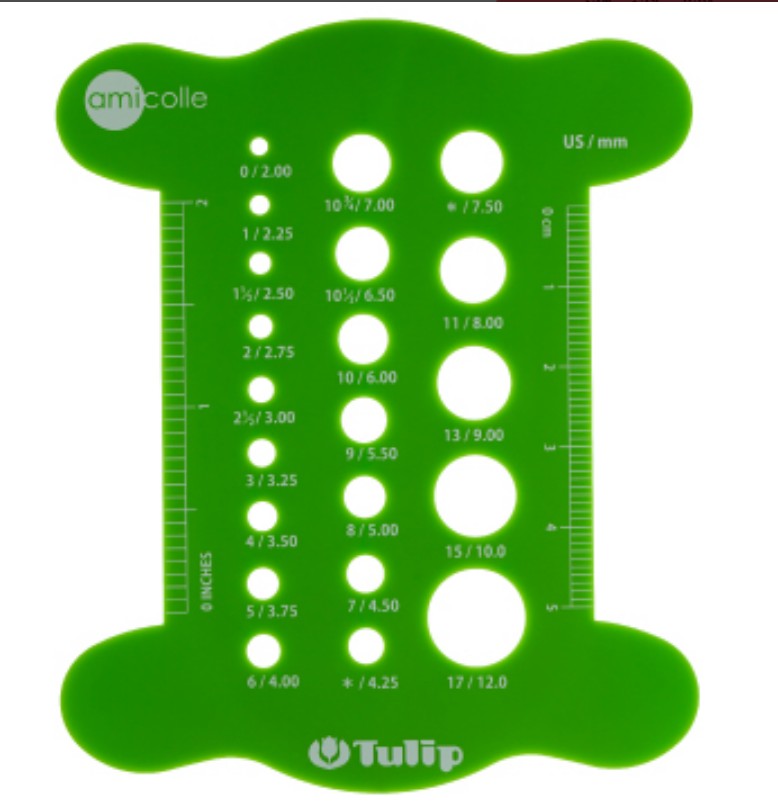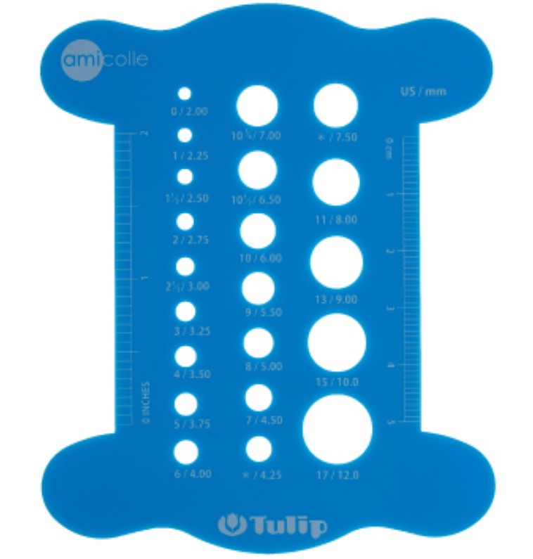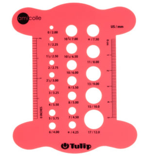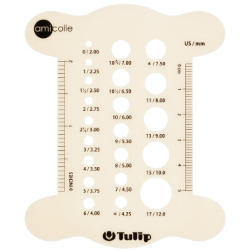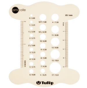 A compact and stylish needle gauge designed to measure knitting needle sizes quickly and accurately. The Tulip Amicolle gauge features 21 measurement holes for both straight and circular needles, along with a convenient side ruler for additional reference. Its lightweight shape makes it easy to carry in any project bag, and the body can also be used as a wool bobbin for winding leftover yarn.