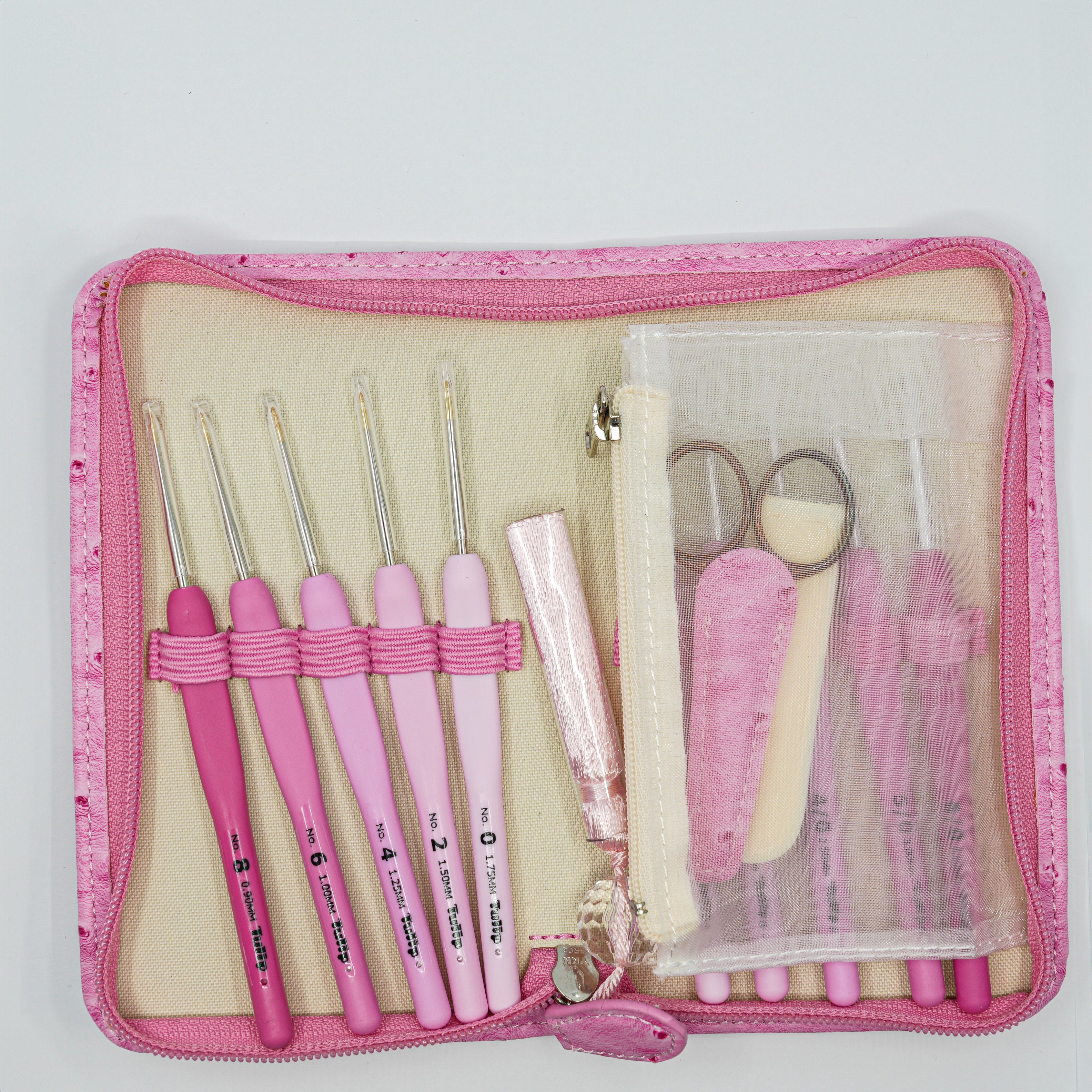 A premium crochet hook set from the ETIMO Rose series by Tulip, crafted in Japan for exceptional comfort and control. This elegant 10-piece set features pink gradation aluminum hooks with soft cushion grips, ideal for long hours of effortless crocheting.