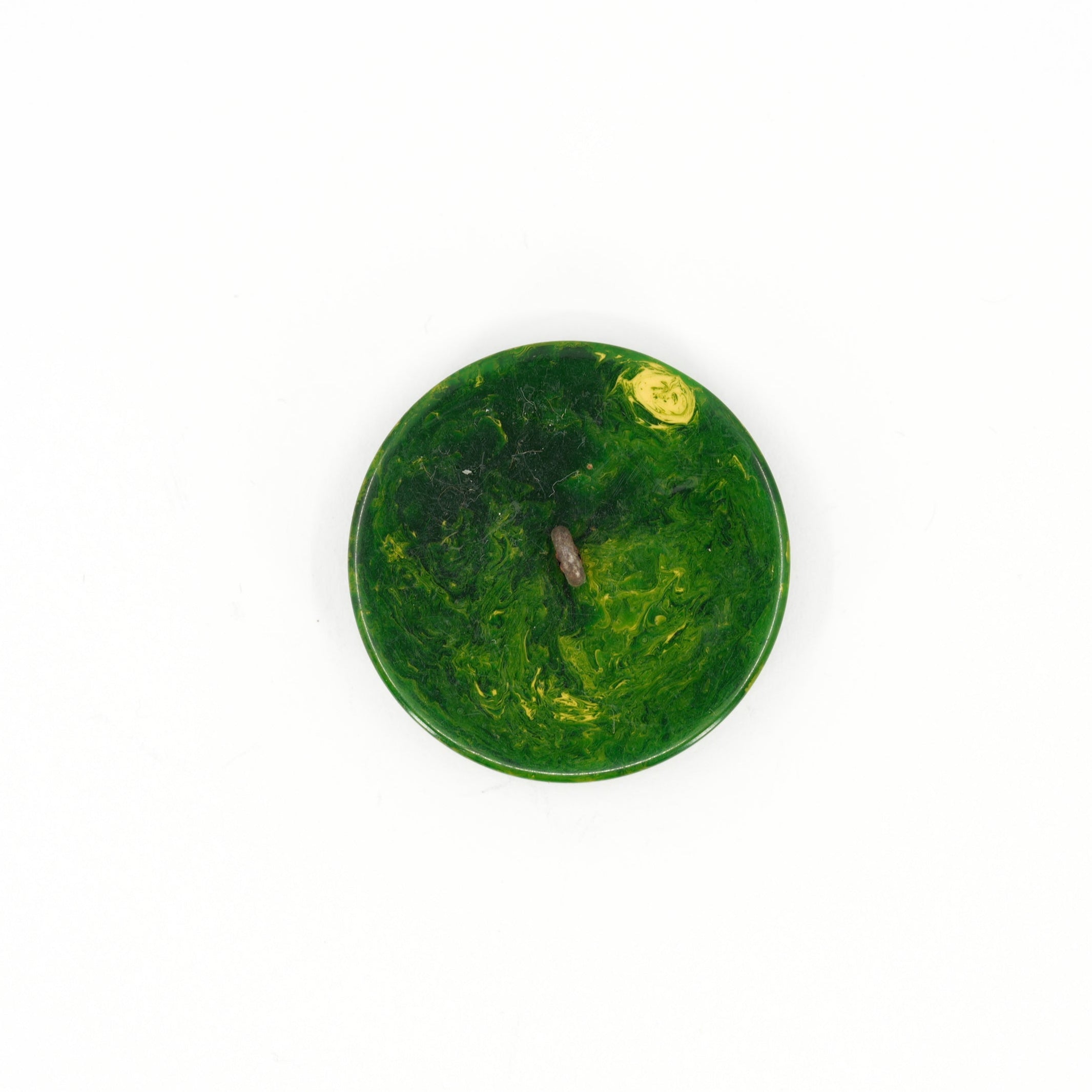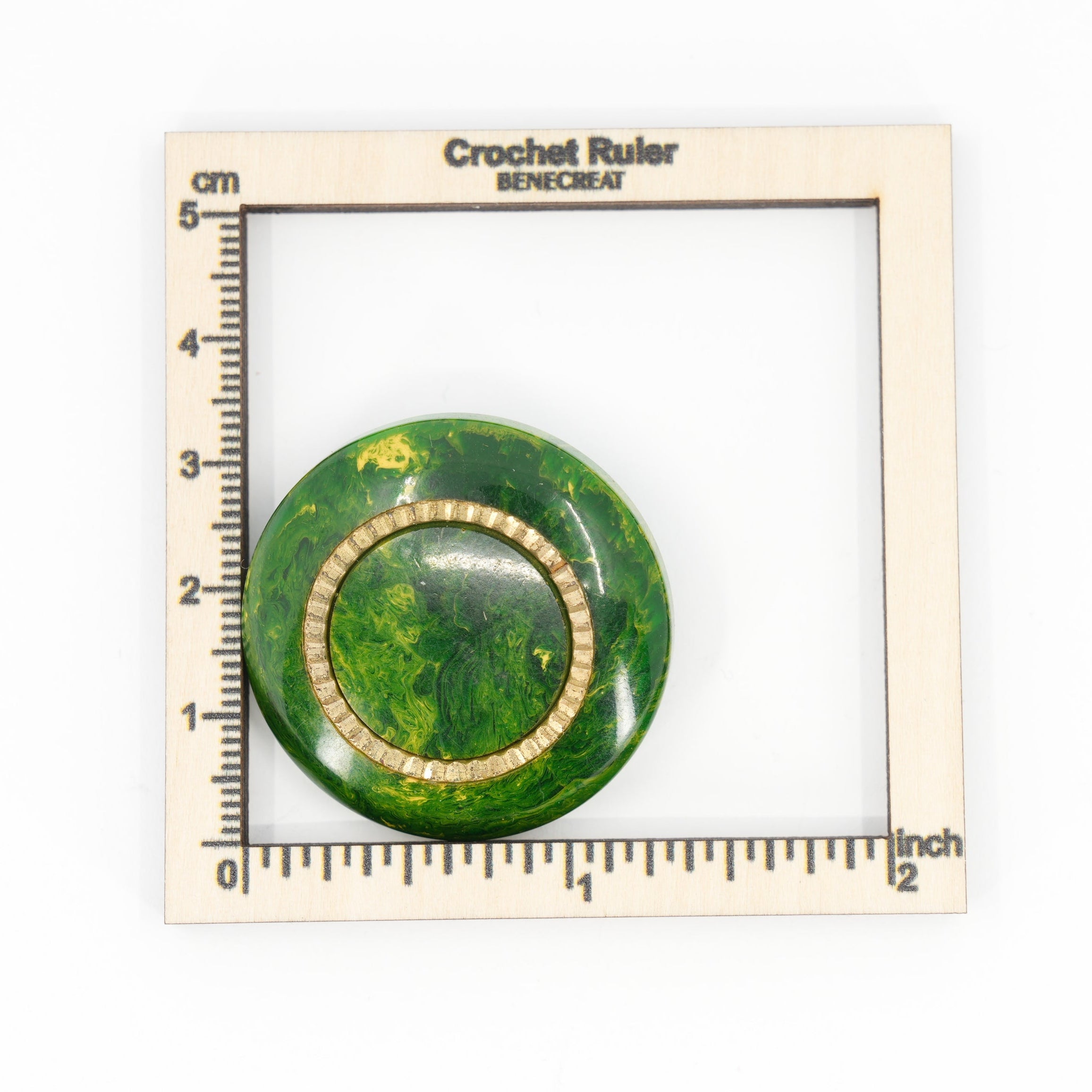 A striking set of vintage green buttons with a bold marbled finish and golden-tone ridged insets. The swirling resin mimics classic bakelite styles, featuring tones from deep forest to chartreuse green, each with a unique marbling pattern. The gold circular inlay adds structure and contrast to the organic surface, offering a balance between vintage charm and modern graphic appeal.