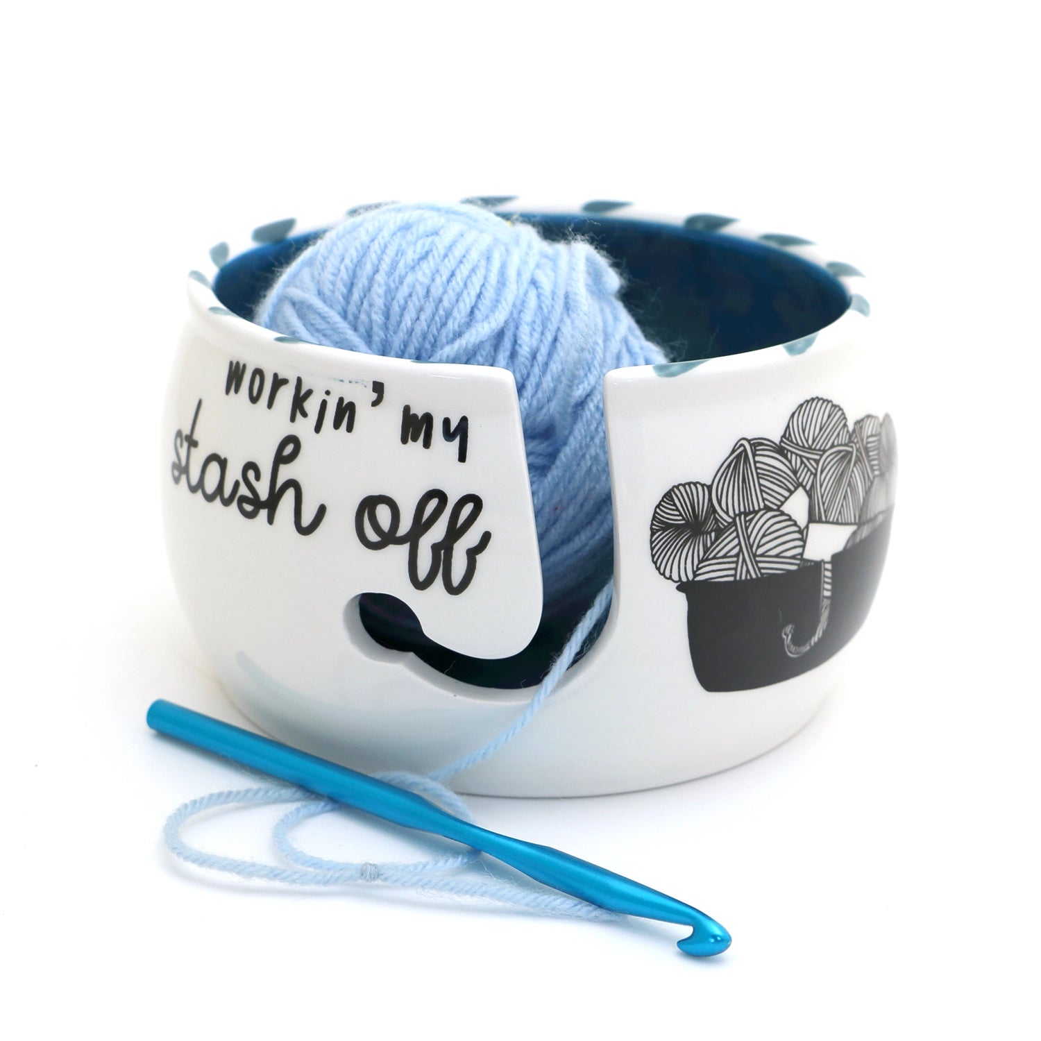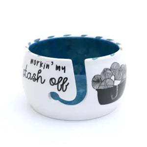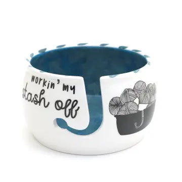 Handmade ceramic yarn bowl reads Working My Stash Off. The struggle with stitches is real! Perfect for the yarnaholic- and by yarnaholic I mean textile curator- who loves to knit or crochet. Interior is teal- colors may vary on your computer monitor. Kiln fired. This yarn bowl measures 6.25 inches across by 3.5 inches tall and has a J yarn release. Yarn bowls make an excellent gift for makers who knit or crochet. They keep yarn from getting tangled and are the perfect place to store works in progress.