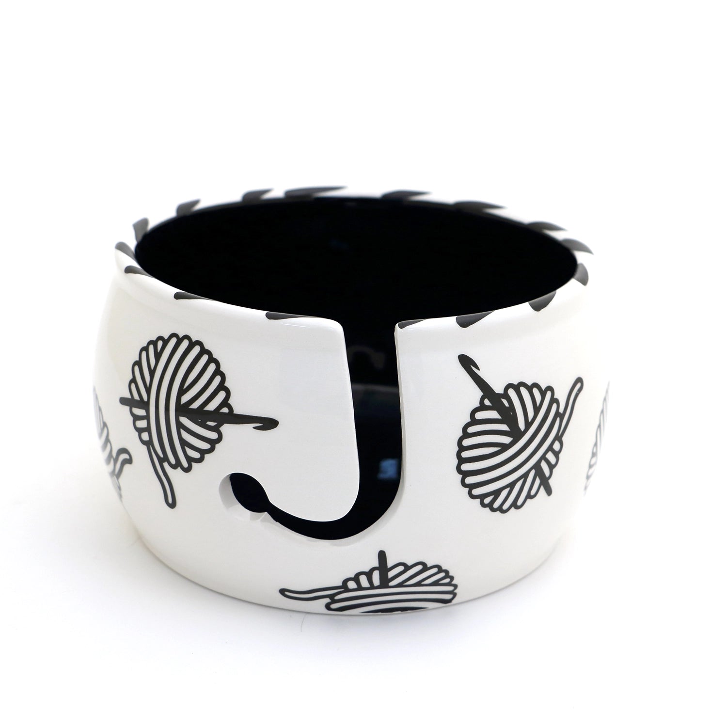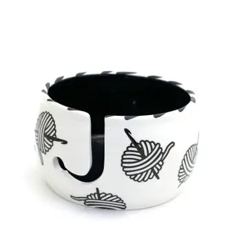 Handmade ceramic yarn bowl features balls of yarn and crochet hooks. Bold modern design. Created from stoneware clay, kiln fired twice to over 1900 degrees. Interior is black. This large yarn bowl measures 6.25 inches wide and 3.5 inches high and features a wool release hook. Makes a great gift for someone who crochets. Yarn bowls prevent yarn from becoming tangled and are a great place to help store works in progress.