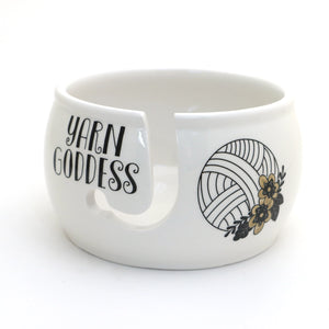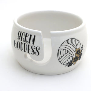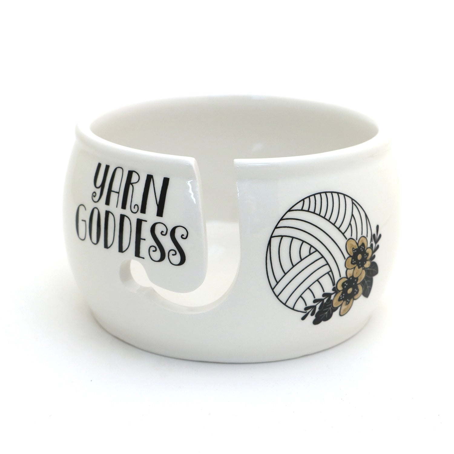 Handmade ceramic yarn bowl reads; YARN GODDESS - and we all know how that deity likes to accept tributes! Glossy white with soft gold accents, Kiln fired. This yarn bowl measures 6.25 inches across by 3.5 inches tall and has a J yarn release. Yarn bowls make an excellent gift for makers who knit or crochet. YARN AND HOOK NOT INCLUDED- photo props only.