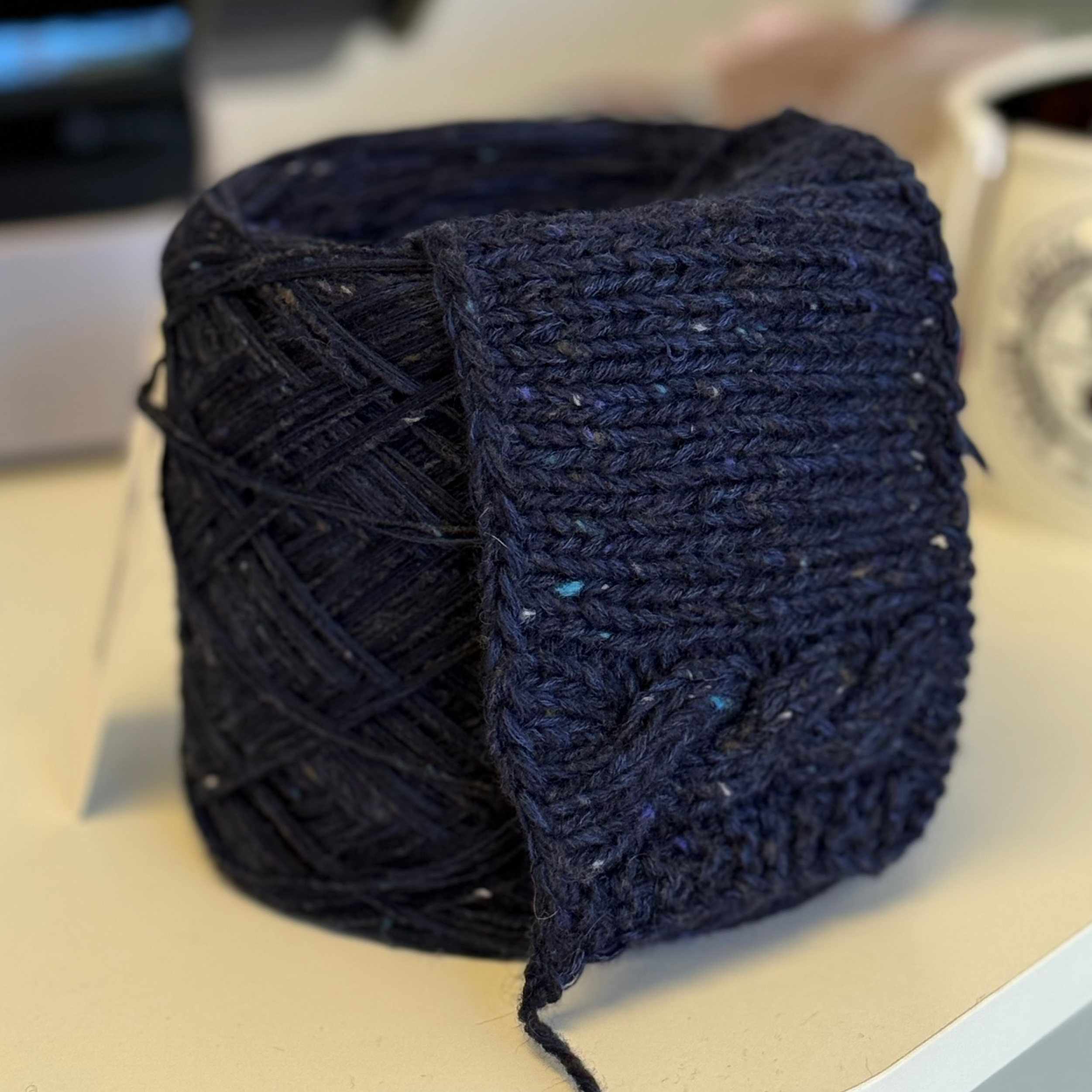 A classic dry merino tweed refined by two tender threads of cashmere spun on a silk core, softly balanced with extra-fine merino and lambswool. The silk adds plasticity and graceful drape, not shine. The sample shown is knitted on 5 mm needles, giving a compact yet pliable fabric with noble, matte texture and quiet depth.