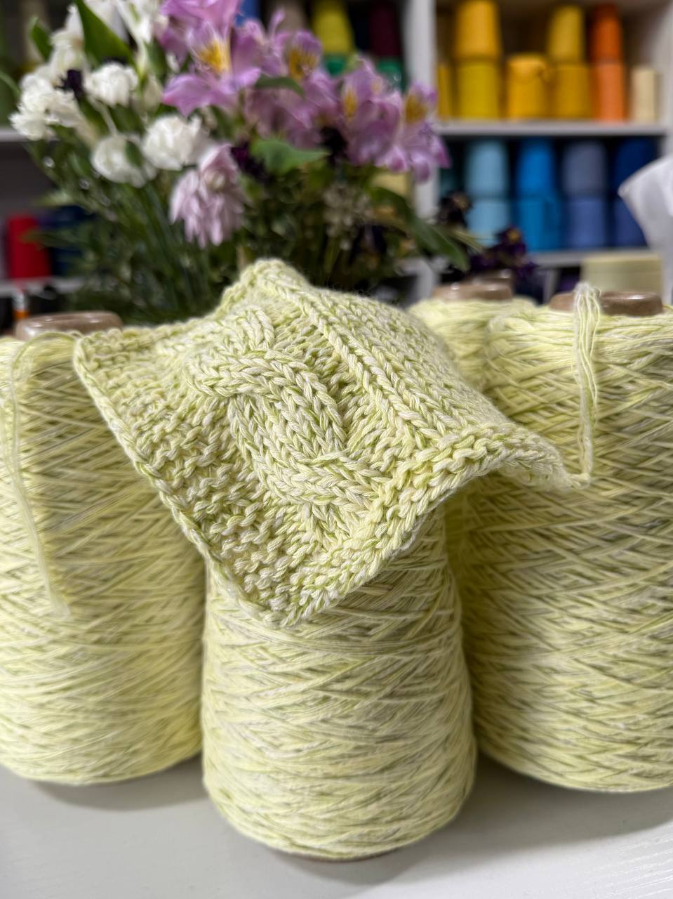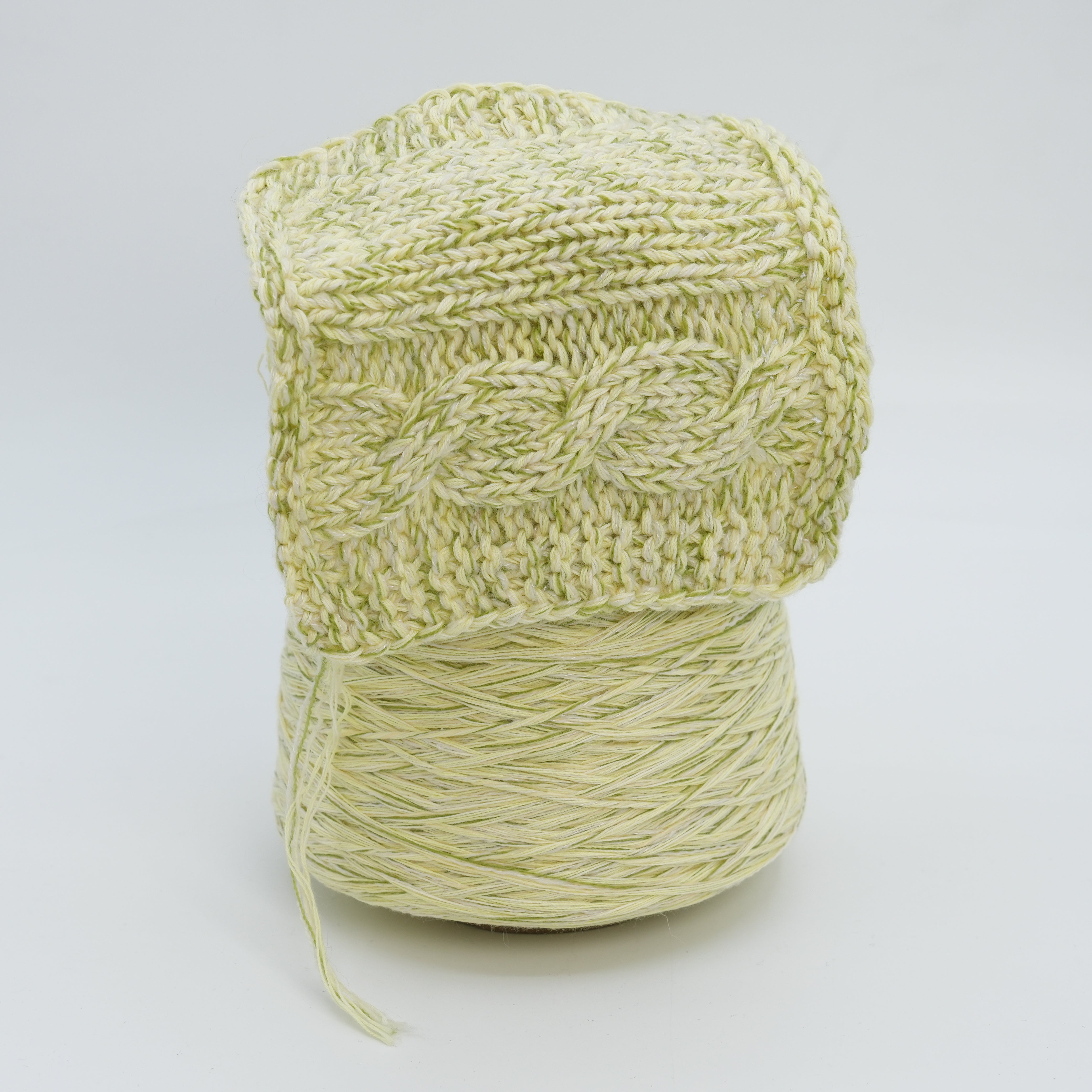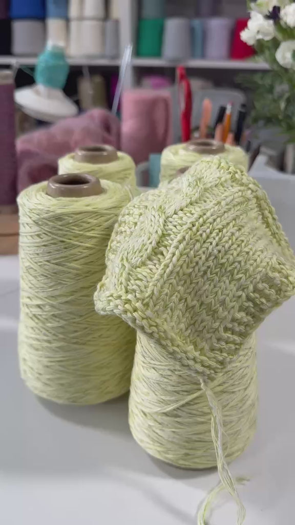 A fresh and wonderfully soft summer blend built on a cotton base, enriched with a touch of merino and cashmere for an exceptionally gentle hand. Cotton keeps the yarn breathable and cool, making it a natural choice for warm-weather projects, while merino adds just enough elasticity to hold the fabric together with clean structure. The small cashmere addition brings a quiet, refined softness that elevates the everyday feel of cotton into something truly special. The color is a delicate interplay of creamy white and soft lime green — an airy, botanical tone that feels light and effortless in any season. The sample, knitted on 5 mm needles, reveals a plush, well-defined fabric with beautiful cable and texture stitch clarity, a smooth surface, and a surprisingly cozy yet breathable handfeel.