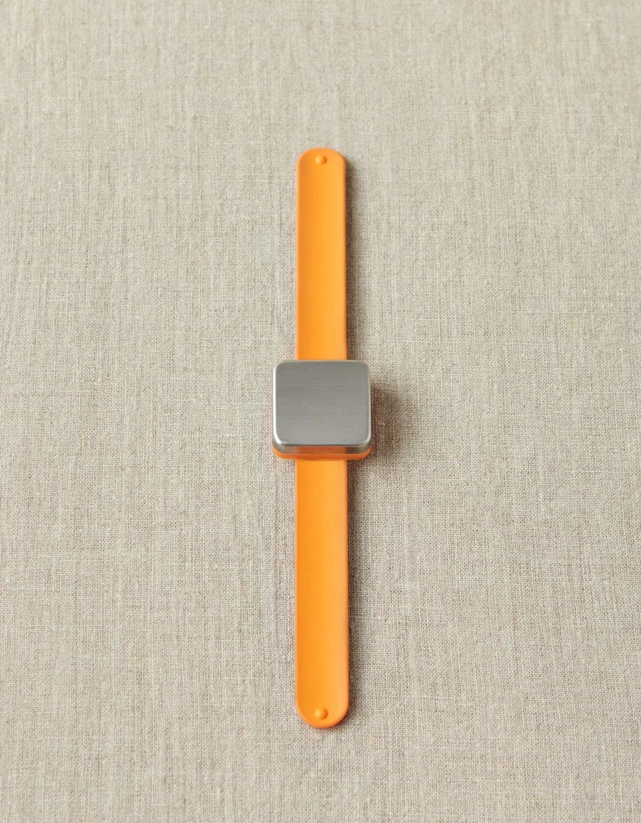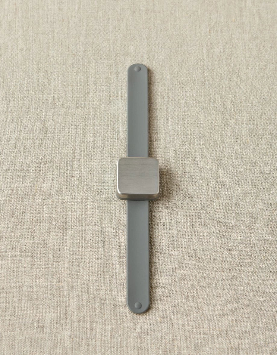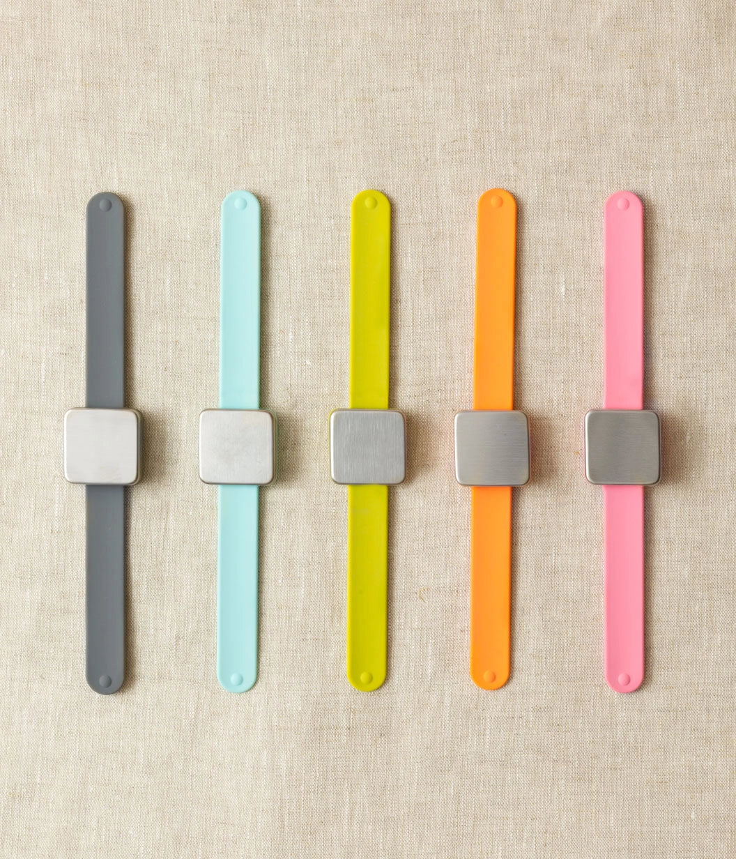 The Cocoknits Maker’s Keep is a modern, versatile tool designed to keep your most-used notions exactly where you need them — within easy reach. With a strong magnet set into a silicone slap bracelet, it securely holds stitch markers, tapestry needles, row counters, and more.