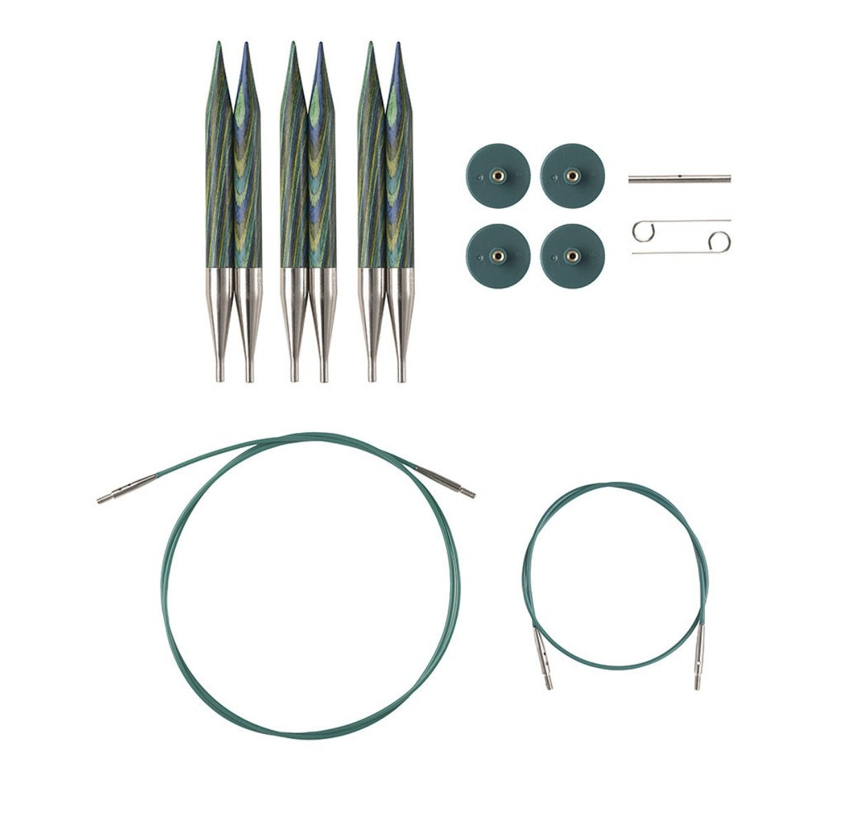 Featuring the smooth joins and perfectly tapered tips that Caspian needles are known for, combined with flexible green cables, this set provides everything you need to tackle your bulky yarn projects. The included cable key allows you to securely tighten your tips to the cables, while the end caps let you safely store works-in-progress. All components are stored in a handy snapped clear vinyl needle case for easy organization.