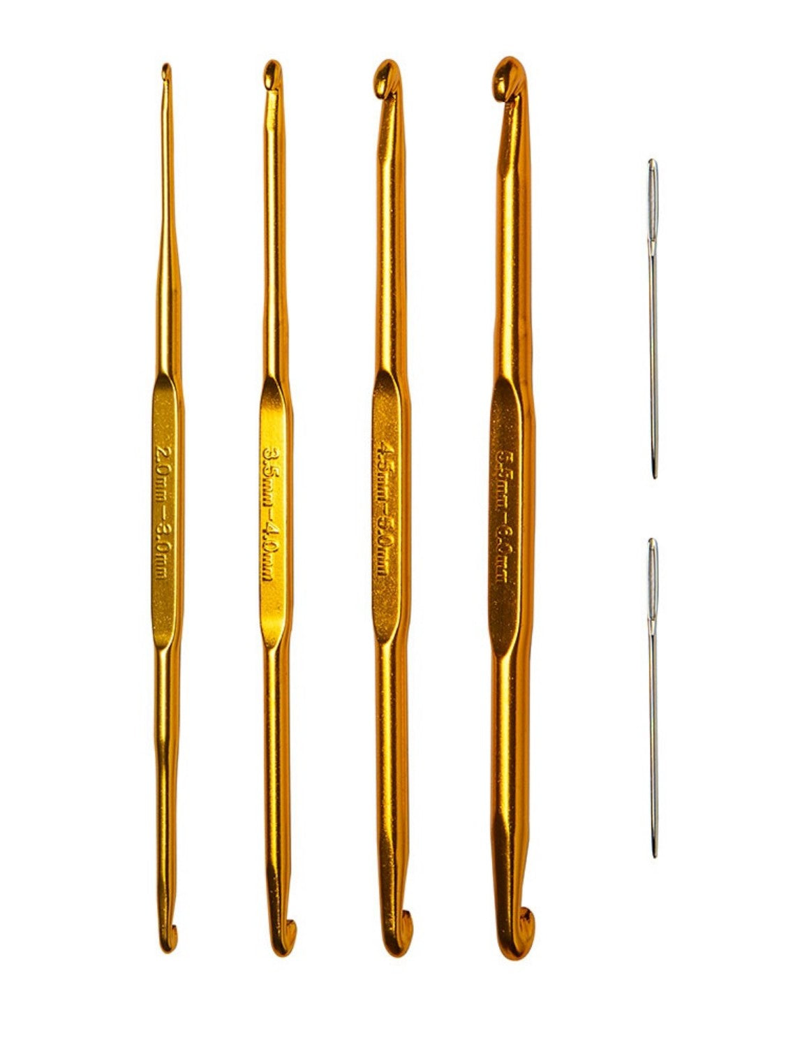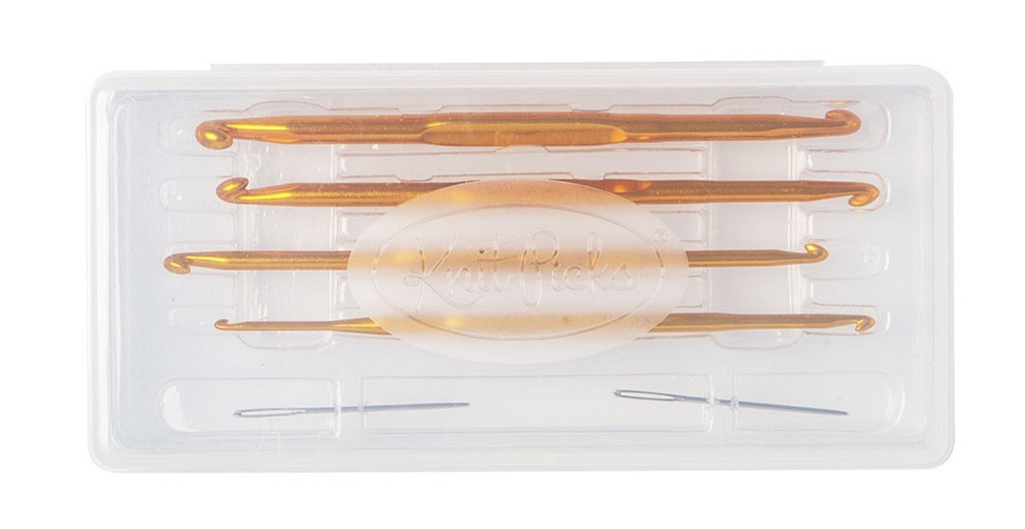 These double-ended Aluminum crochet hooks are perfect for picking up stitches. The double ends give you plenty of size options to work with too. Packaged in a convenient storage case, the set contains crochet hooks, 5 3/8" in length, with ends in size 2.0, 3.0, 3.5, 4.0, 4.5, 5.0, 5.5, and 6.0mm along with 2 blunt tip tapestry needles.