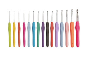Each hook is color-coded and clearly marked by size, so you can quickly identify the right tool while working. The smooth, tapered aluminum tips provide consistent stitch glide across a wide range of yarn weights.
