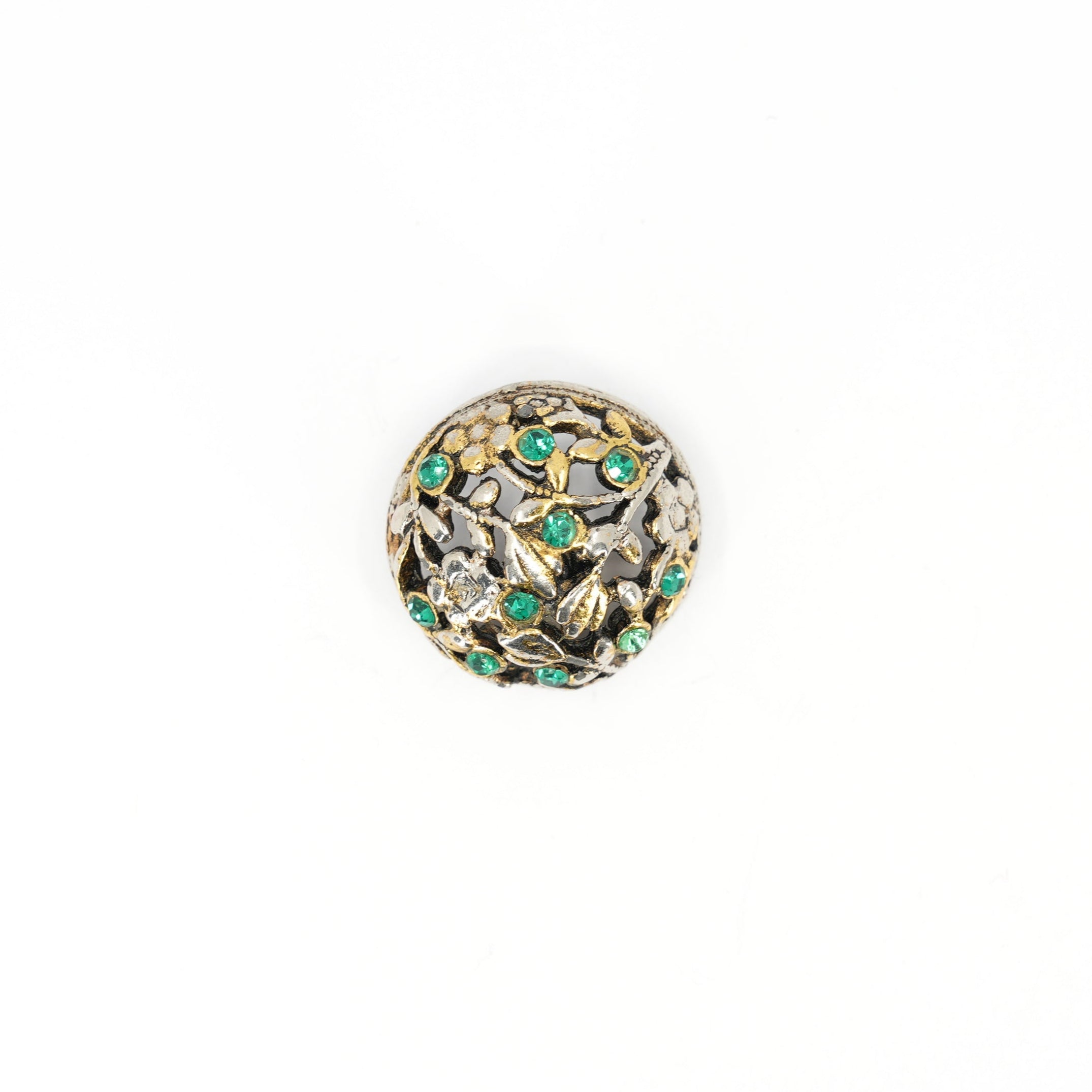 Lush and theatrical, this pair of vintage domed buttons evokes costume jewelry more than haberdashery. Cast in warm metallic tones and richly decorated with leafy filigree and bright green rhinestones, they shimmer like something from a mid-century stage or opera coat. The construction is openwork, allowing light to pass through and highlight the stones and texture.