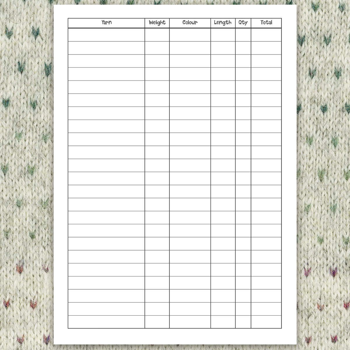 A handy A5 48 printed page jotter. Left hand pages have squares to design or chart your patterns, and the right hand page is lined for your notes! Even handier- is the inside cover has those handy yarn and needle conversions, M1R- M1L and kitchener stitch etc- and room to colour in the back page if you fancy it!! ;0).