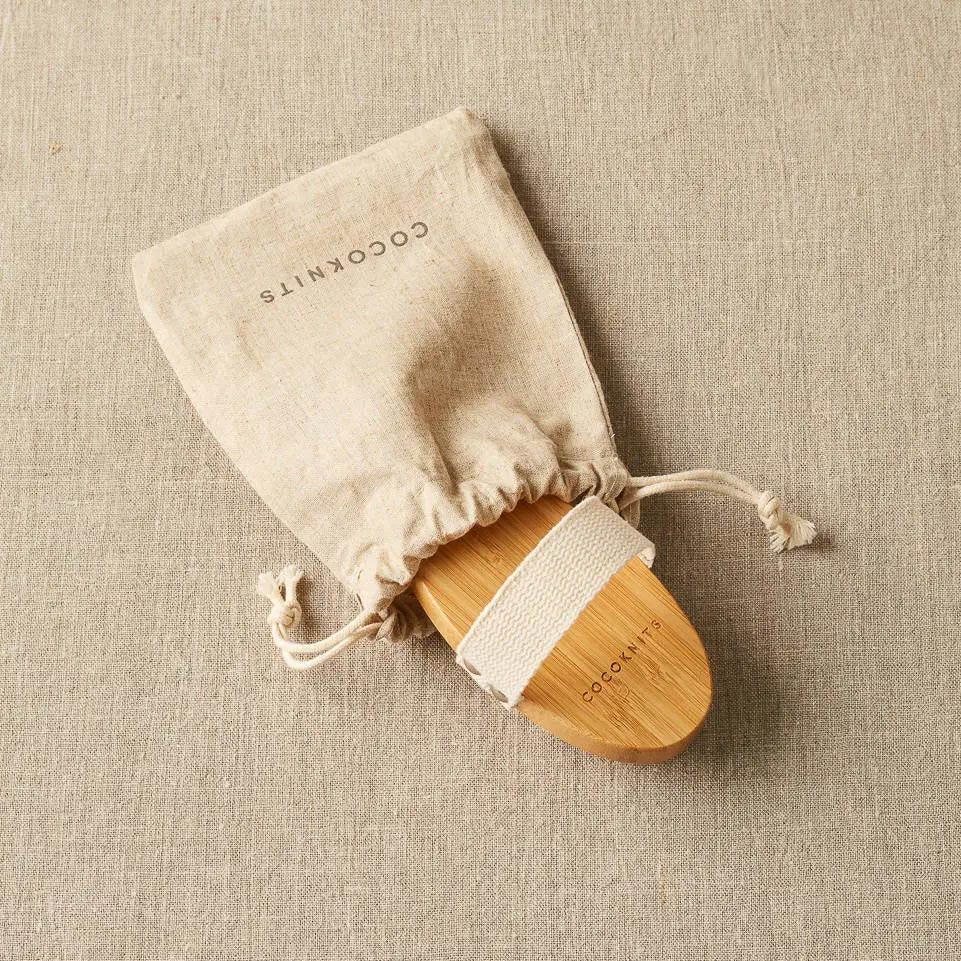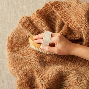 From Cocoknits, this gentle but effective brush is designed to remove lint, smooth fibers, and revive the loft and texture of garments made from soft animal fibers. Made with natural boar bristles and a bamboo handle, it works better than synthetic options — removing fuzz without static or pulling.