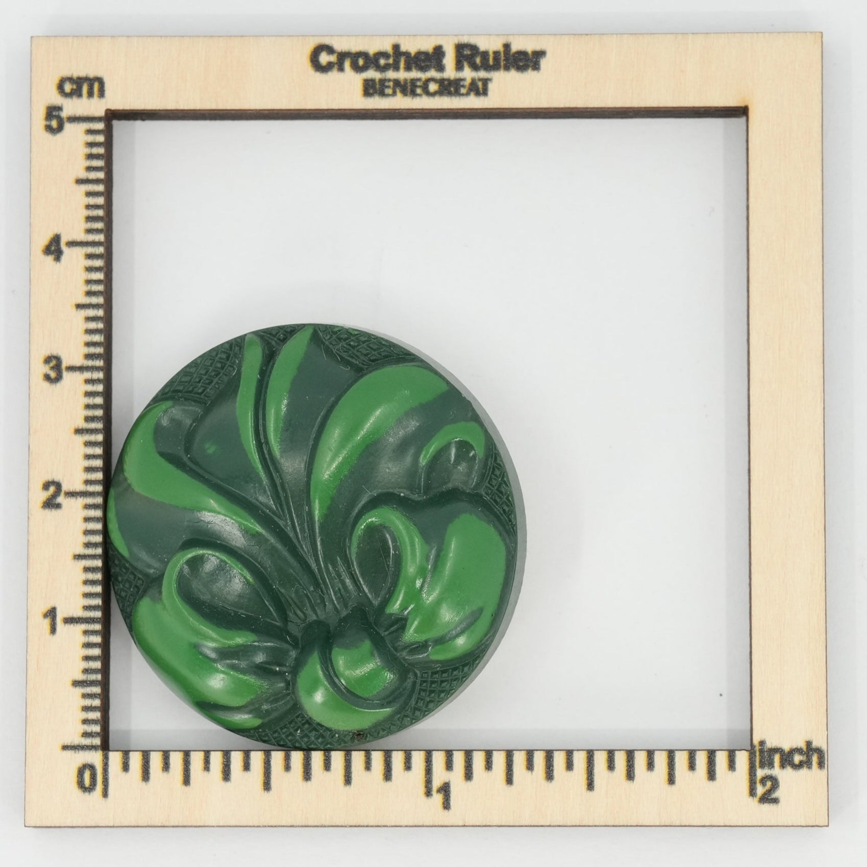 This deep green vintage button features a bold, high-relief carving of a stylized ribbon or floral swirl. The layered design is fluid and dimensional, blending Art Deco geometry with a botanical twist. With its dramatic shape and jewel-toned color, this button brings both elegance and character to any garment.